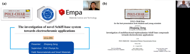 图(a)为曾志强同学在ZOOM线上会议平台的即时口头汇报;图(b)为大会的奖项委员会主席Henning博士(Fraunhofer Institute Microstructure of Materials and Systems IMWS,德国),正在公布POLY-CHAR “Prize for Best Presentation from Students and Young Scientists”奖项得主。