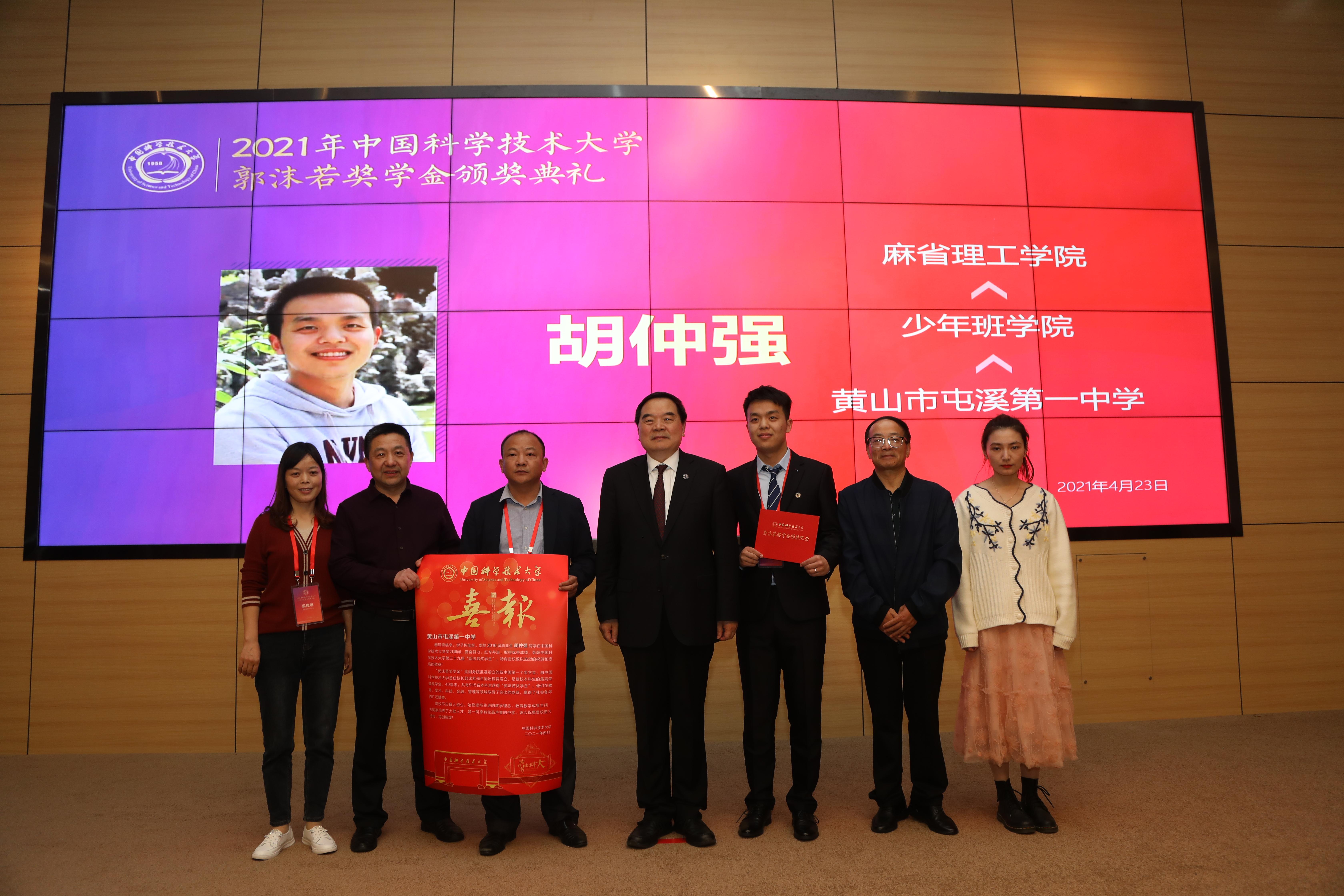 在颁奖环节,包信和校长首先为郭沫若奖学金获奖学生逐一颁发获奖证书,为获奖学生中学校长颁赠“喜报”,并与获奖学生及其家长、老师代表一同合影留念。