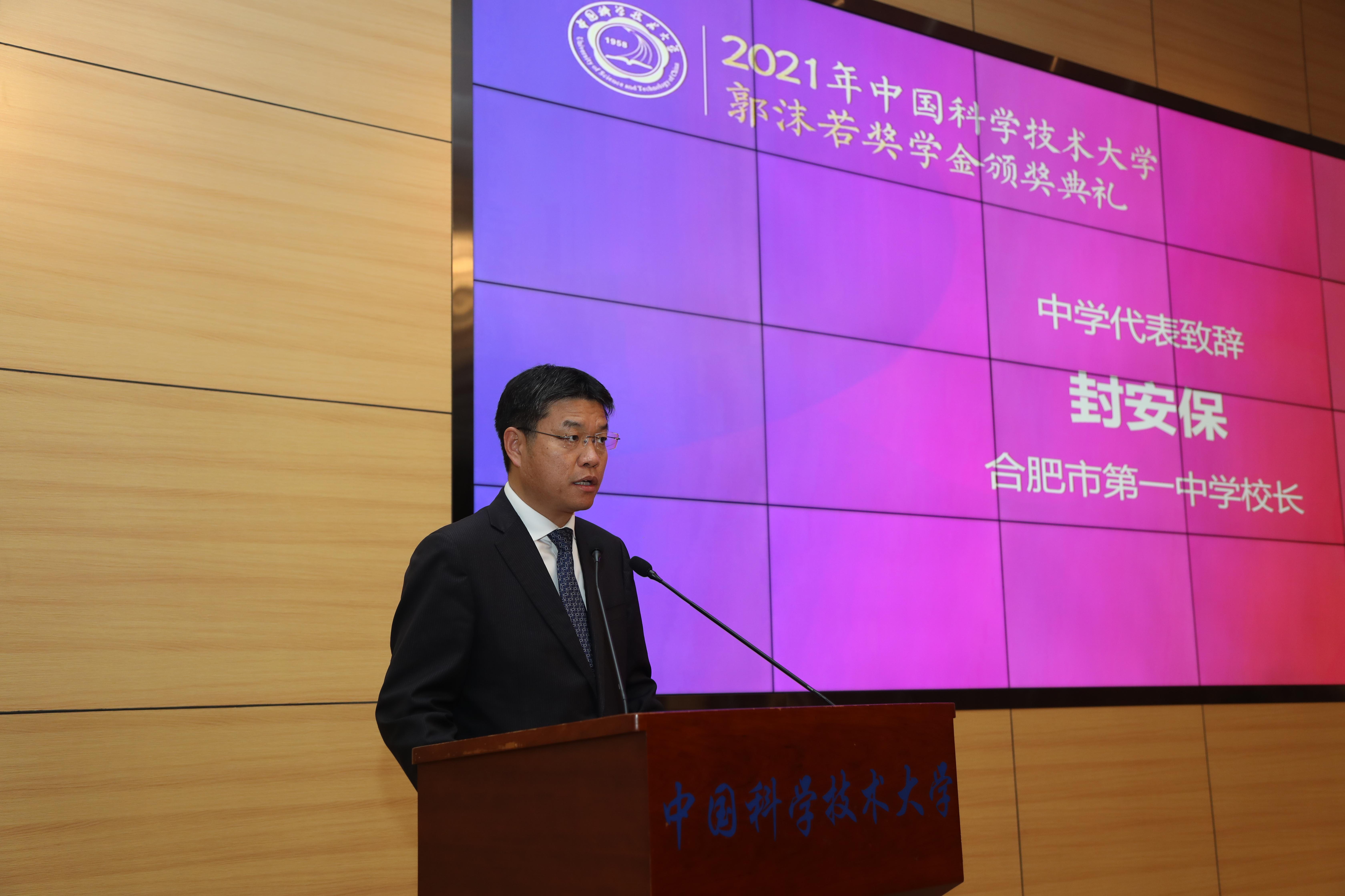 封安保在致辞中说,合肥一中与中国科大渊源颇深,双方在课程建设、英才计划、特长生培养等方面开展过多次合作与交流,每年合肥一中都向中国科大输送众多优秀学子,在科大的合肥一中学子,在学业上都获得了长足的进步,至今合肥一中共有32位同学获得中国科大郭沫若奖学金,这是同学们的光荣,也是合肥一中的光荣。郭沫若奖学金既是荣誉也是责任,责任意味着“创新”和“报国”,希望同学们练就过硬的科研本领,为实现中华民族伟大复兴的中国梦贡献力量。