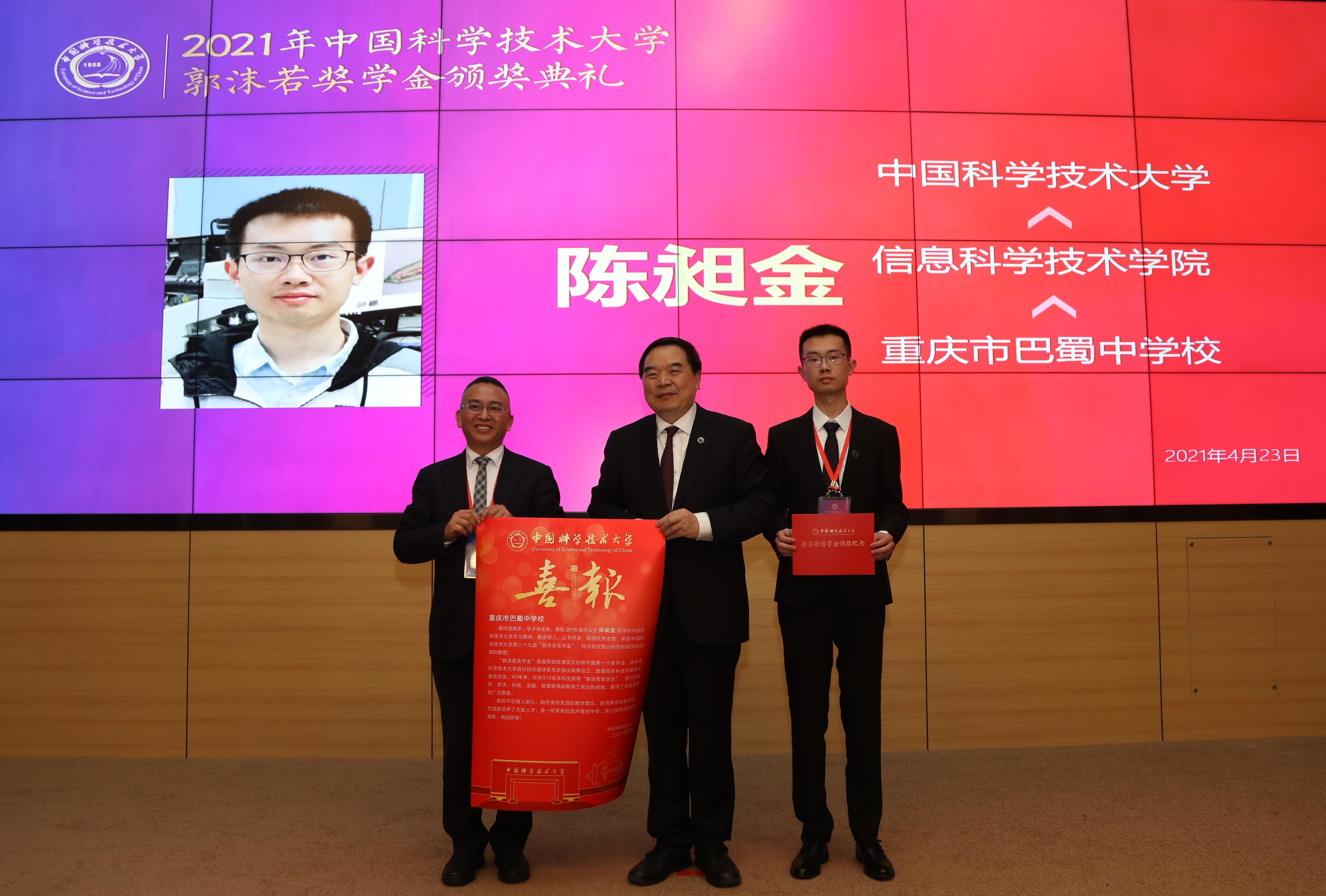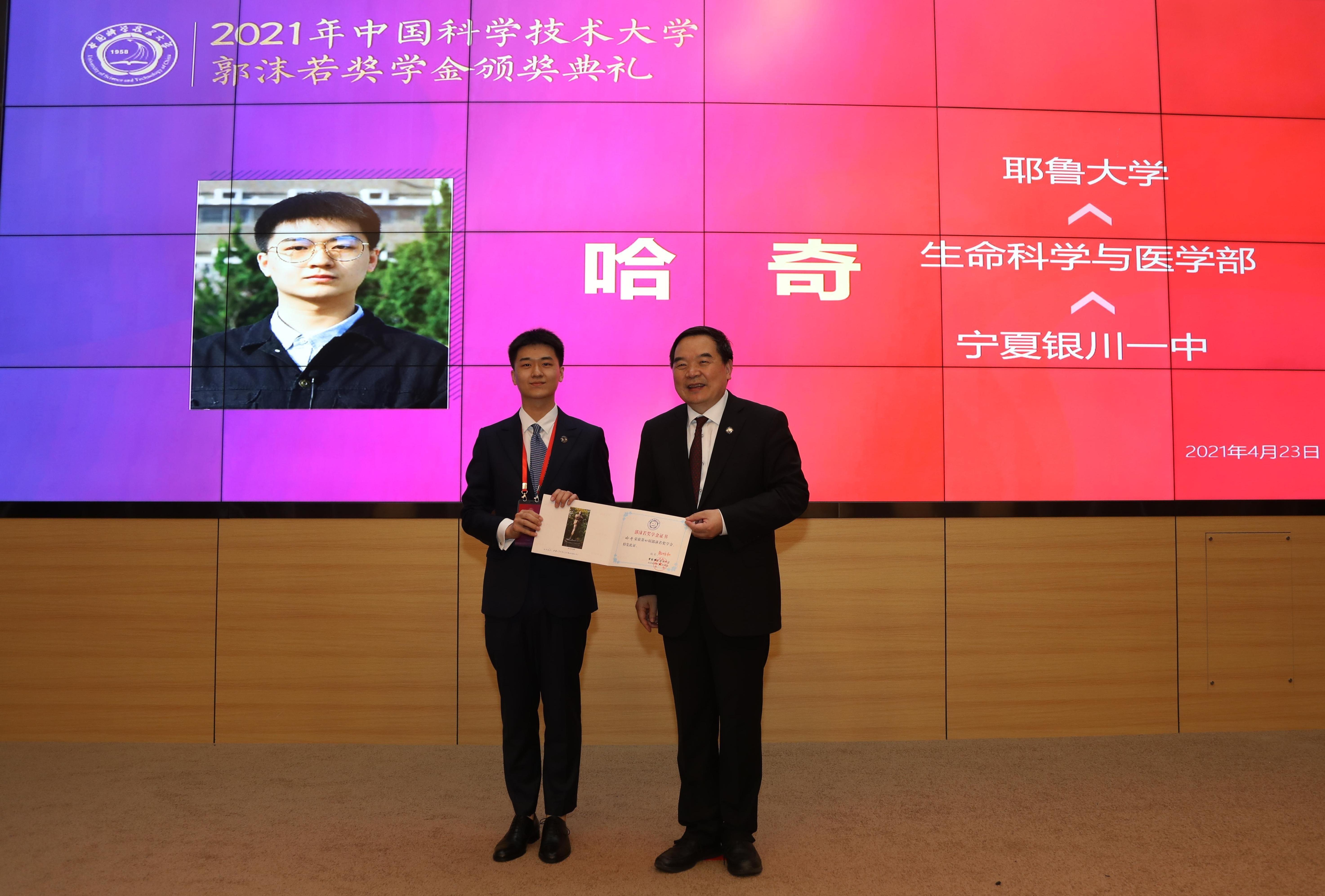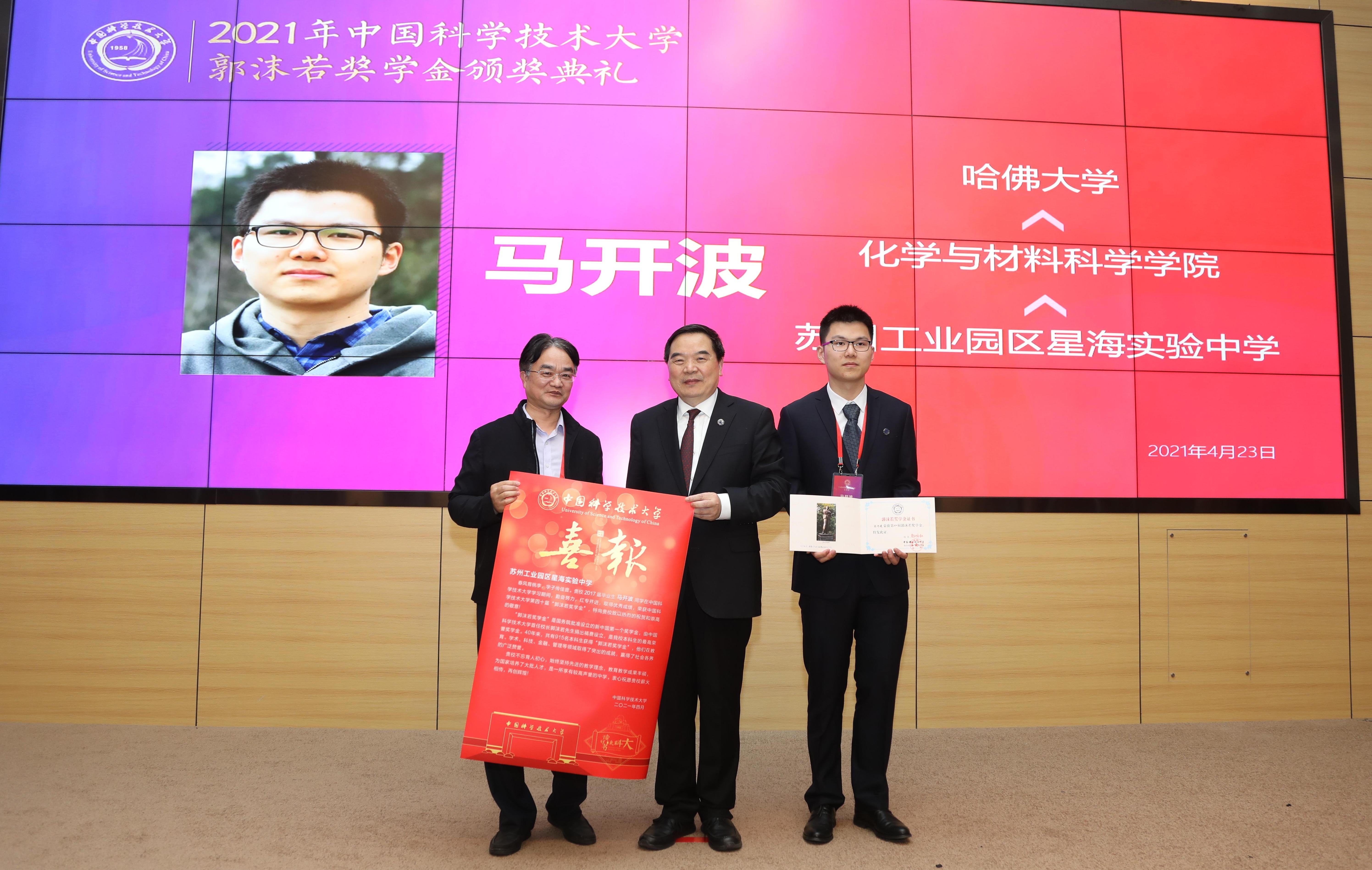 4月23日下午,2021年郭沫若奖学金颁奖典礼在东校区理化大楼东三报告厅举行。校长包信和院士出席典礼,向获奖同学送上深情寄语,并为他们一一颁奖。党委常务副书记蒋一主持颁奖典礼。党委常委、校长助理、教育基金会副理事长傅尧,校长助理、教务长周丛照,首届“郭沫若奖学金”获得者唐明校友,北京校友会会长刘冬生校友、新创基金会理事长石兵校友,中学校长代表、合肥市第一中学校长封安保,中学校长代表、华南师范大学附属中学副校长吴青等出席颁奖典礼。第39届、40届“郭沫若奖学金”获得者,以及部分获奖学生的中学校长、老师、家长和亲属参加了颁奖典礼。
