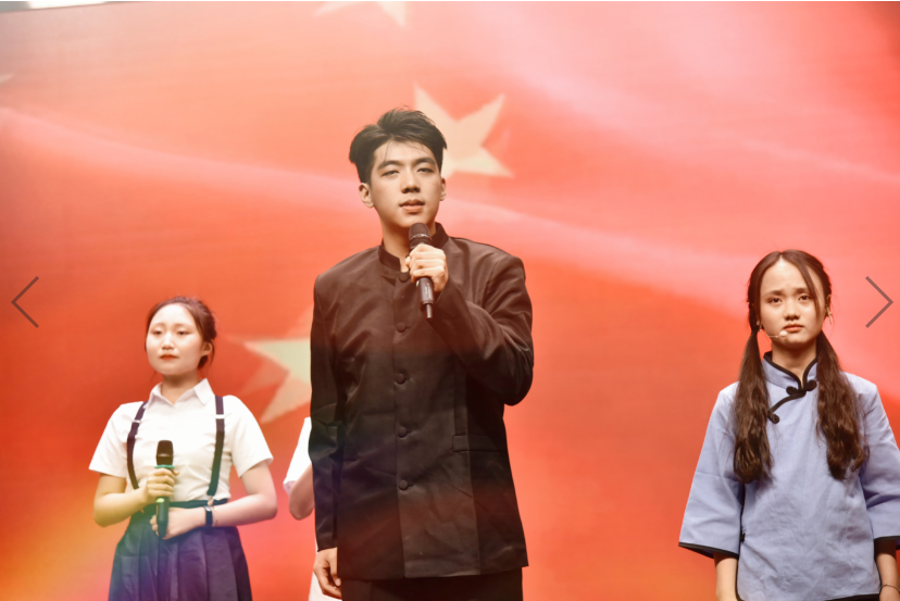 “用茫茫的夜色作墨,用疮痍的土地作纸……”低沉悲壮的音乐声轻轻扬起;舞台上,身着民国学生装的同学们以一首激情澎湃的《青春中国》,拉开了朗诵课的序幕。诗歌从鸦片战争的国耻说起,讲到五四的爱国青年觉醒,再到今天新中国的强大,字里行间,充满了诗人对祖国的热爱,而这份热爱,也深深感染着参演的每一位学生。