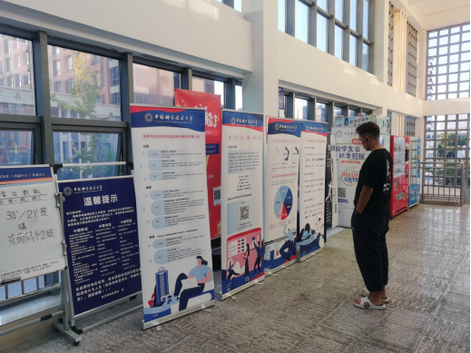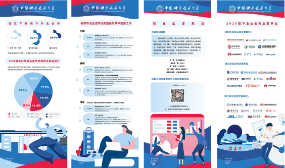 展架展示了近5年来我校本科生国(境)外深造、国内深造、工作等三个大类去向统计数据,通过展示本科生国(境)外深造、保研、考研等不同升学方式的具体时间流程,本、硕、博毕业生选择就业的主要单位,生涯意识启蒙唤醒等内容为本科生从择业就业和升学的角度,进行多方面引导。让本科新生从入校开始便对未来实现怎样的发展、怎样实现发展有一个更清晰认识。