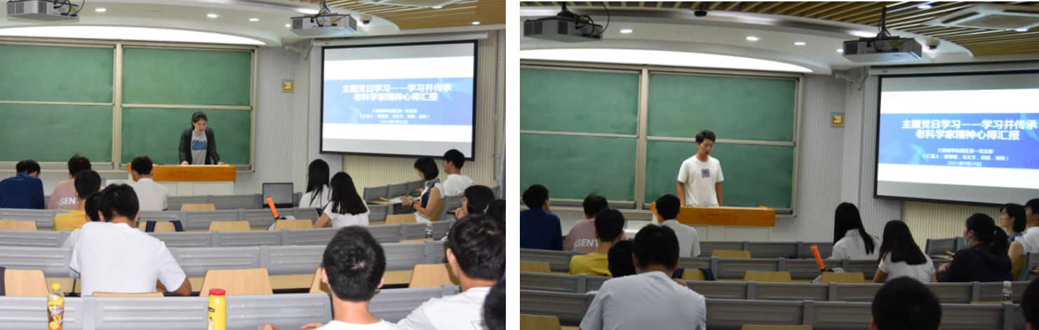 参会人员共同聆听了来自西区党支部的几位党员和入党积极分子学习传承老科学家精神的心得体会。马文文,尉慧聪,谭超,潘锐四位同学结合南仁东先生等老科学家的感人事迹,分享了自己的心得体会。