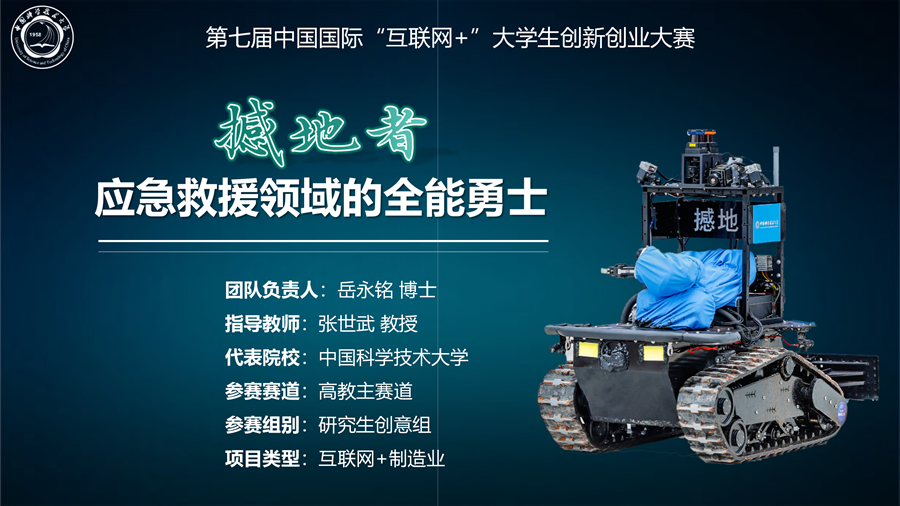 项目简介:近年来各种事故灾害时有发生,给救援人员和人民群众的生命安全都带来巨大威胁。项目团队希望开发实用、先进的应急救援机器人,以提高救援效率,减小救援人员伤亡。通过对现有的救援设备进行分析,发现其功能较为有限,且基本不具备智能性和自主性。为此团队经过技术攻关,研发了具备自主探测和自主作业能力的智能应急救援机器人“撼地者”。撼地者主要由四大核心系统组成,分别是跨地形运动作业系统,多自由度精准作业系统,全向感知与自主导航系统,以及实时影像回传与遥操作系统。这四大系统相互配合,可以完成越障清理、搬运抓取、智能探测、自主导航、营救伤员等诸多救援任务。