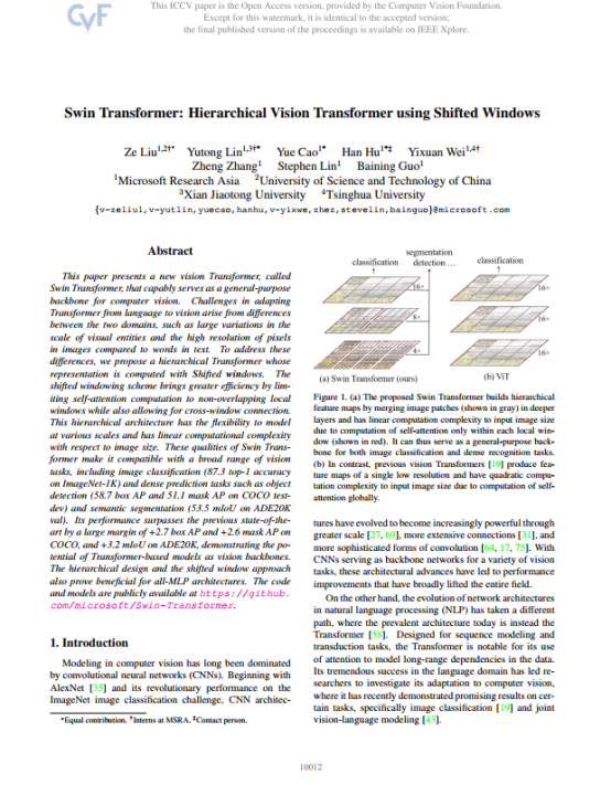 该论文Swin Transformer 是第一个基于Transformer的通用计算机视觉骨干网络。它的核心在于将Transformer强大的建模能力和优秀的视觉先验相结合,包括层次性、局部性和平移不变性。Swin Transformer在物体检测和语义分割等任务中大幅度刷新了此前的纪录,在近半年中被用于广泛的视觉任务,并进一步证明了其通用性和有效性,包括视频动作识别、对比学习、图像恢复、行人重识别等。