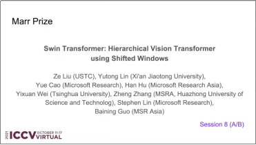 近日,计算机领域世界顶级学术会议,国际计算机视觉大会(ICCV2021)召开,我校信息科学技术学院博士生刘泽以第一作者身份发表的论文“Swin Transformer: Hierarchical Vision Transformer Using Shifted Windows” 获得了本届大会的最佳论文奖:马尔奖(Marr Prize)。本届ICCV大会共收到6152篇投稿,其中1612篇论文被接收,评选出1篇论文为本届大会的最佳论文,获得马尔奖。马尔奖(Marr Prize)因计算机视觉之父、计算神经科学的创始人大卫?马尔(David Marr)而得名,每两年评选一次,是计算机视觉领域的最高荣誉之一。
