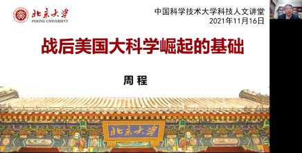 11月16日晚,北京大学医学人文学院院长周程教授应邀做客我校“科技人文讲堂”,为我校师生作题为《战后美国大科学崛起的基础》的主题报告。讲座由科技哲学系王高峰副教授主持,并通过腾讯会议在线直播,我校博士生公共课《中国马克思主义与当代》选课同学及人文与社会科学学院部分师生近千人在线聆听了线上报告。