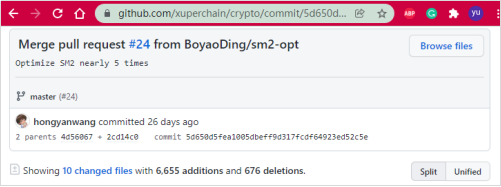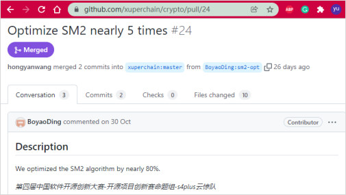 目前,s4plus-云惊队对XuperChain的密码库(https://github.com/xuperchain/crypto)所提交的反映上述优化的Pull Request已经于2021年12月1日被xuperchain/crypto合并接受。