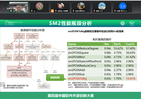在历时三个多月的比赛中,s4plus-云惊队成员密切配合、分工明确、攻坚克难,并且积极和指导老师进行讨论研究,最终实现了对国密SM2算法的优化。在优化中深入调研文献,通过设计预计算窗口和对蒙哥马利模乘的优化,完成了算法层次的优化;通过使用向量指令集,借助开源工具c2goasm快速将编写的高效C函数翻译成Go编译器使用的Plan9汇编,再通过开展强度削弱、语句重排、循环展开等程序优化,实现了对国密算法的计算优化;通过对国密算法实现代码的深入分析以及对Go语言及其编译系统的充分认识,结合逃逸分析实现了Go语言特性相关的内存优化。最终,经过不懈努力,将SM2算法在x86_64架构下的整体性能提升了接近五倍,其中对于SM2算法的解密操作的性能提升更是达到了接近九倍的优化效果。
