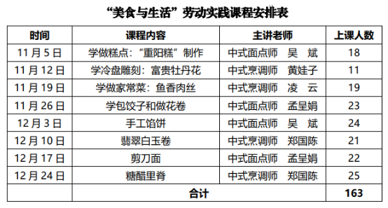 本次劳动实践课程为切实培养学生实践能力,全程按课表进行,主要教授内容有:重阳糕、冷盘雕刻、鱼香肉丝、饺子花卷、手工馅饼、翡翠白玉卷、剪刀面和糖醋里脊。课堂上,烹饪大师亲身示范,为每位同学进行细致讲解。同学们热情高涨,亲自制作美味佳肴的过程让大家受益匪浅,开阔了视野,增强了动手能力,磨炼了意志。