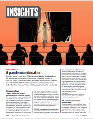 3月11日,国际顶尖杂志《Science》刊登了中国科学技术大学生命科学与医学部2018级本科生医学英才班姜家桢同学的通讯短评“A pandemic education”(SCIENCE, 2022, Vol 375, Issue 6585, pp. 1086-1087, DOI: 10.1126/science.abo5791)。该短评发表于《Science》杂志Letters板块中的NextGen VOICES专栏,现于Science官网封面推荐。《Science》杂志每月刊登一期NextGen VOICES专栏,面向全世界的青年科学家征集科学技术及相关领域新鲜问题的评论文章,本期专栏的主题为“A pandemic education”,与《Science》杂志该期纪念世卫组织宣布新冠肺炎全球大流行两周年特刊的主题相得益彰,旨在反思COVID-19大流行以及结合现有情况分析可能指引科学家群体在疫情期间发挥积极作用的课程设计。