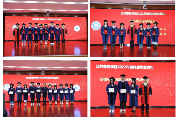 仪式进入优秀毕业生荣誉证书颁发环节。首先陈伟、藏武芳、杨辉依次为MPA中心22位优秀毕业生颁发证书,接着由丁望斌为中国科学技术大学10位优秀毕业生颁发证书,最后由魏玖长为安徽省普通高等学校3位优秀毕业生颁发证书。同学们满怀喜悦之情从颁奖嘉宾的手中接过象征收获和荣誉的优秀毕业生证书!