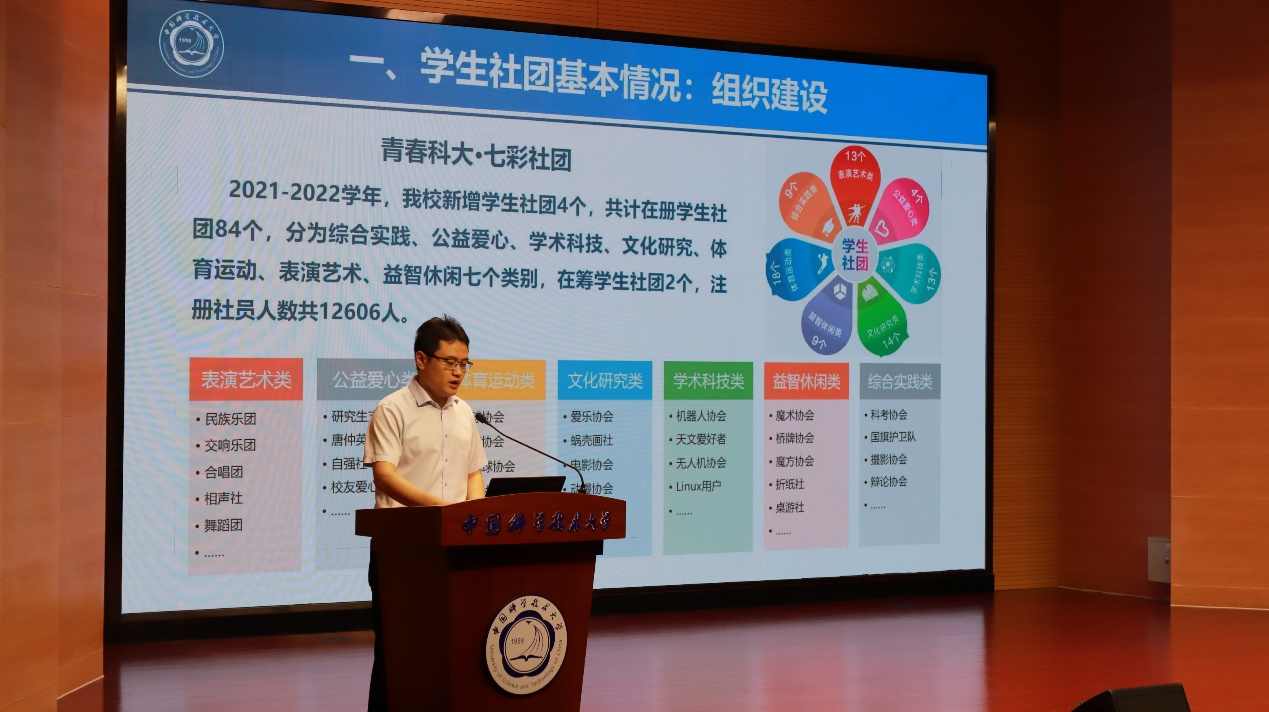刘淇向大会作社团管指委2021-2022学年工作报告。报告围绕学生社团基本情况、社团管指委工作情况、工作计划三个方面,详细报告了学生社团概况、活动开展和经费报销等内容,并介绍了社团管指委在过去一年里完成巡视整改要求、开展“喜迎二十大、永远跟党走、奋进新征程”主题教育实践系列活动、社团“四统一”、星级评定、指导教师聘任与考核、“双一流”学生社团建设、“跃动青春文艺季”“悦动青春体育季”和“溯风传统文化月”等系列活动工作情况。报告提出社团管指委将从加强党建带团建、进一步做好社团日常管理、巩固优良传统和强化学生骨干队伍建设四个方面发挥学生社团思想引领作用,促进社团健康有序发展,创造更多育人成果。