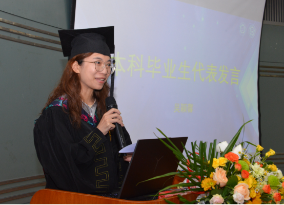 接下来,本科毕业生代表吴颖馨上台发言。她表示作为学院的首届本科毕业生,感到无比自豪。三年来,同学们通过勤奋学习、刻苦钻研、凝心聚力,不管是班集体还是个人都满载而归。她回顾了在科大求学常怀好奇之心,从未停下探索的步伐,这种求知与探索的意愿与能力是本科求学路上最难能可贵的收获。她对一路走来的老师、同学们表达了诚挚的感谢,并送上了深切的祝福。