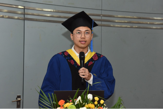 硕士毕业生代表陶硕发言。他追溯了三年来校园里走过的足迹,与学院老师们的相处,与同窗好友的陪伴,对学校的培养、老师的教诲、同学们的帮助表达了诚挚的感谢,他表示离开校园后,将脚踏实地做好本职工作,悉心竭力传播科大精神,无愧于学院的培养。