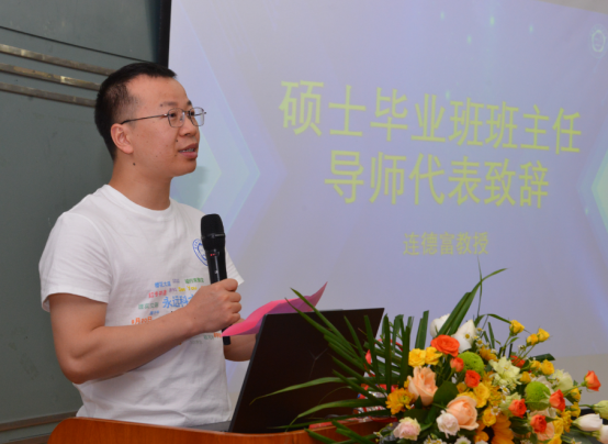 硕士毕业班班主任、导师代表连德富教授致辞。他鼓励所有学子砥砺奋进,不断超越自我,就像我们的专业课程《深度学习》,需要不断地从失败之中汲取经验教训,才能达到更高的水平;也像《强化学习》,需要坚持和忍耐,平衡好眼前和未来的收益,敢于冒险和探索,使人生价值最大化。他希望毕业生秉承科大精神,为国家、为社会做出更多贡献!