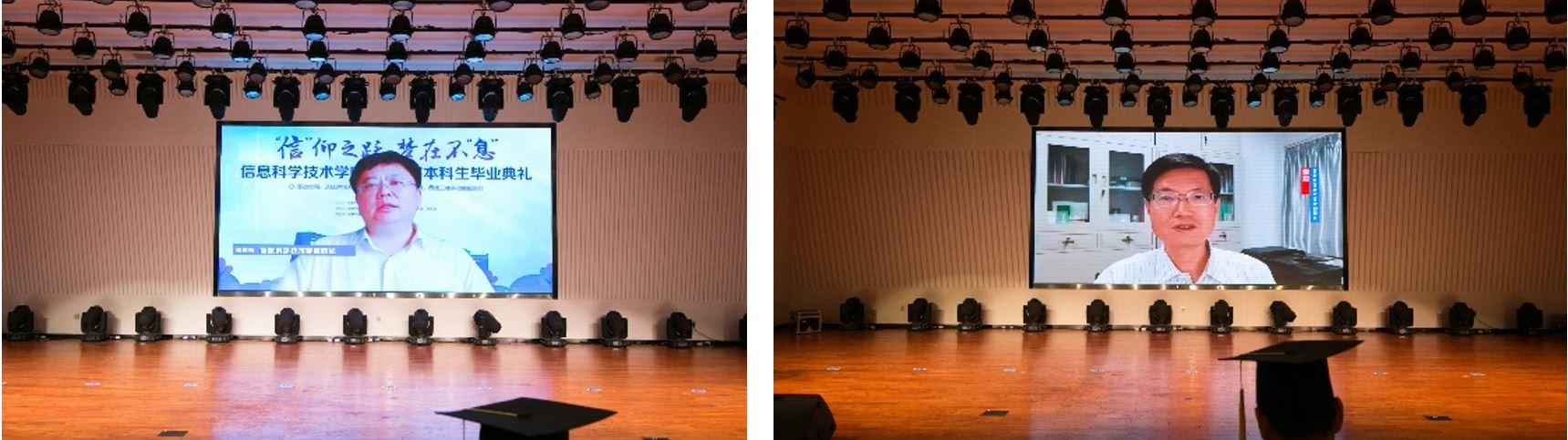 毕业典礼现场还播放了张勇东院长,李斌副院长给毕业生的毕业寄语视频。张勇东院长告诉同学们要感恩父母,正是父母的陪伴和支持,我们才能一路走到今天,不忘学校、学院的培养,顺应时代潮流,不忘初心,砥砺前行。李斌副院长向我们提出了四点期望:保持积极、保持自信、保持勇敢、保持善良。无论处于什么样的时刻,我们都要保持积极的心态,保持自信,相信自己的能力,心怀勇气,这样才能更好的面对苦难,克服困难。