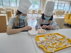 有了理论的基础,仍需要切身的实践。到了期盼已久的包馄饨环节,同学们摩拳擦掌,拿起馄饨皮开始了各自的“创作”。在同学们手下诞生了形态各异的馄饨:有经典端庄的"元宝",有简单可爱的“帽子”,还有孟老师教授的活灵活现的“金鱼”。欢乐的笑声在食堂里回荡,同学们脸上洋溢着动手实践的喜悦与满足。