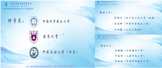 7月8日至10日,由山东大学承办的中国大学生物理学术竞赛华东地区赛在线上成功举行。我校代表队由阎嘉浩、蔡卓凡、邓博洋、李雨桥、刘谨鸣五名队员和廖潇宇、张庆川两名领队组成,参与备赛工作的徐俊瑞和陈世江同学观摩了本次比赛。物理实验教学中心的陶小平、赵伟、赵霞、浦其荣四名教师作为指导教师和裁判参加了本次比赛。经过两天共四轮紧张激烈的比赛,我校参赛队总分排名华东地区第一名,荣获本次比赛的团队特等奖,李雨桥同学和阎嘉浩同学分别获得最佳正方和最佳反方个人奖项。