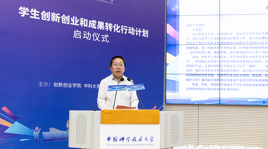 7月12日上午,中国科学技术大学学生创新创业和成果转化行动计划(以下简称“行动计划”)启动仪式在西区第三教学楼举行。校长包信和院士、校党委副书记傅尧及化学与材料科学学院、工程科学学院、生命科学学院、网络空间安全学院、创新创业学院、中科大资产经营公司等相关单位负责人出席仪式,我校创新创业导师代表、各院系师生代表以及学生基金管理团队代表等参加了本次活动。校党委常委、副校长周丛照主持仪式。