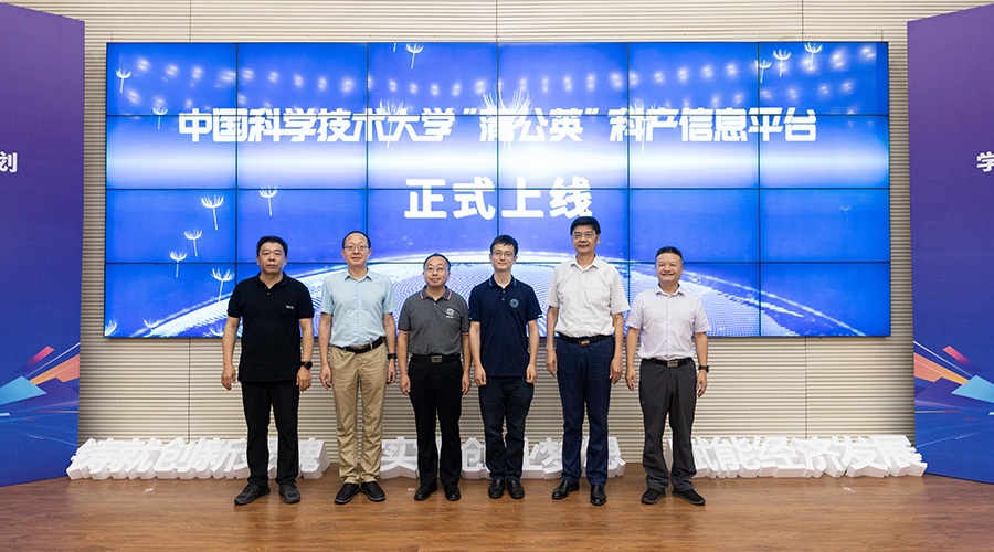 化学与材料科学学院执行院长刘世勇、工程科学学院执行院长吴恒安、生命科学学院执行院长臧建业、网络空间安全学院执行院长俞能海及活动主办单位相关负责人共同启动中国科大“蒲公英”科产信息平台上线。