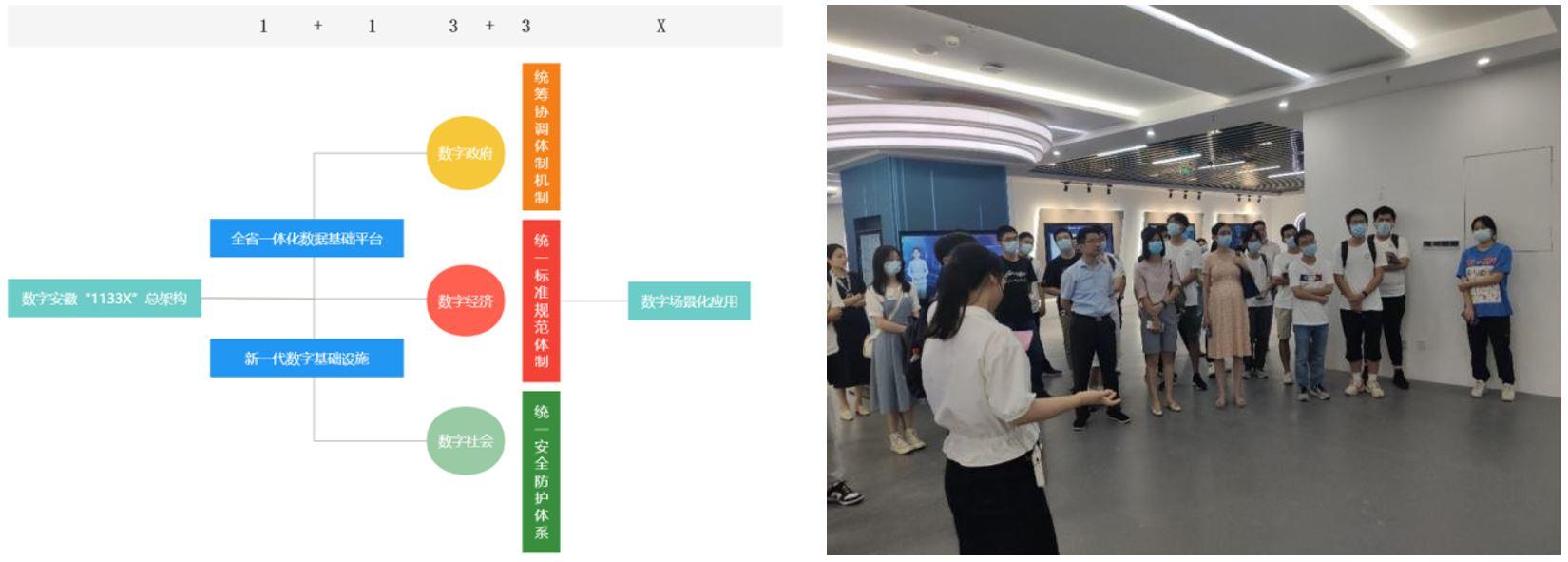 讲解员用绘声绘色的解说与丰富多样的数据可视化展示材料向大家介绍了安徽省数字化建设的整体概况,包括顶层设计与底层应用。顶层设计上,同学们了解了“1133X”数字安徽架构;底层应用上,大家具体认识到数字技术在数字政府、数字经济、数字社会三大领域地现实场景化应用,也全面了解了安徽省在数字化进程中的发展历程和重大成果。
