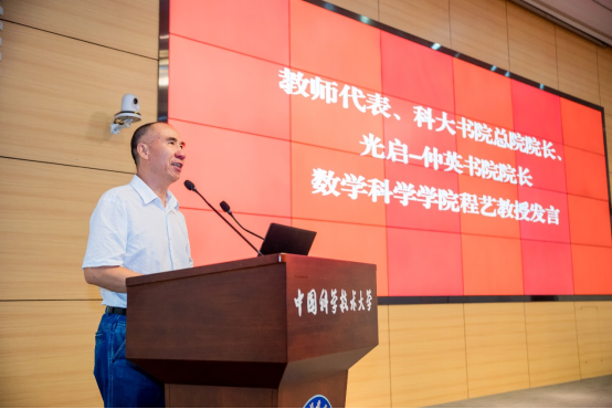 科大书院总院院长、光启-仲英书院院长、数学科学学院程艺教授作为教师代表发言。程艺长期从事数学教学、科研以及管理工作,坚持为少年班学院本科生讲授数学基础课程,并为“科大少年班精品课”录制了《数学分析》(B1、B2)精品课程。程艺代表全体教师欢迎2022级新同学,并结合自己在科大40余年学习工作经历,勉励同学们注重全面发展,提高综合素质;培养学科兴趣,打牢数理基础;保持身心健康,绽放青春活力。他希望同学们积极参与书院各项活动,维护书院良好生活环境,为书院建设尽一份力。