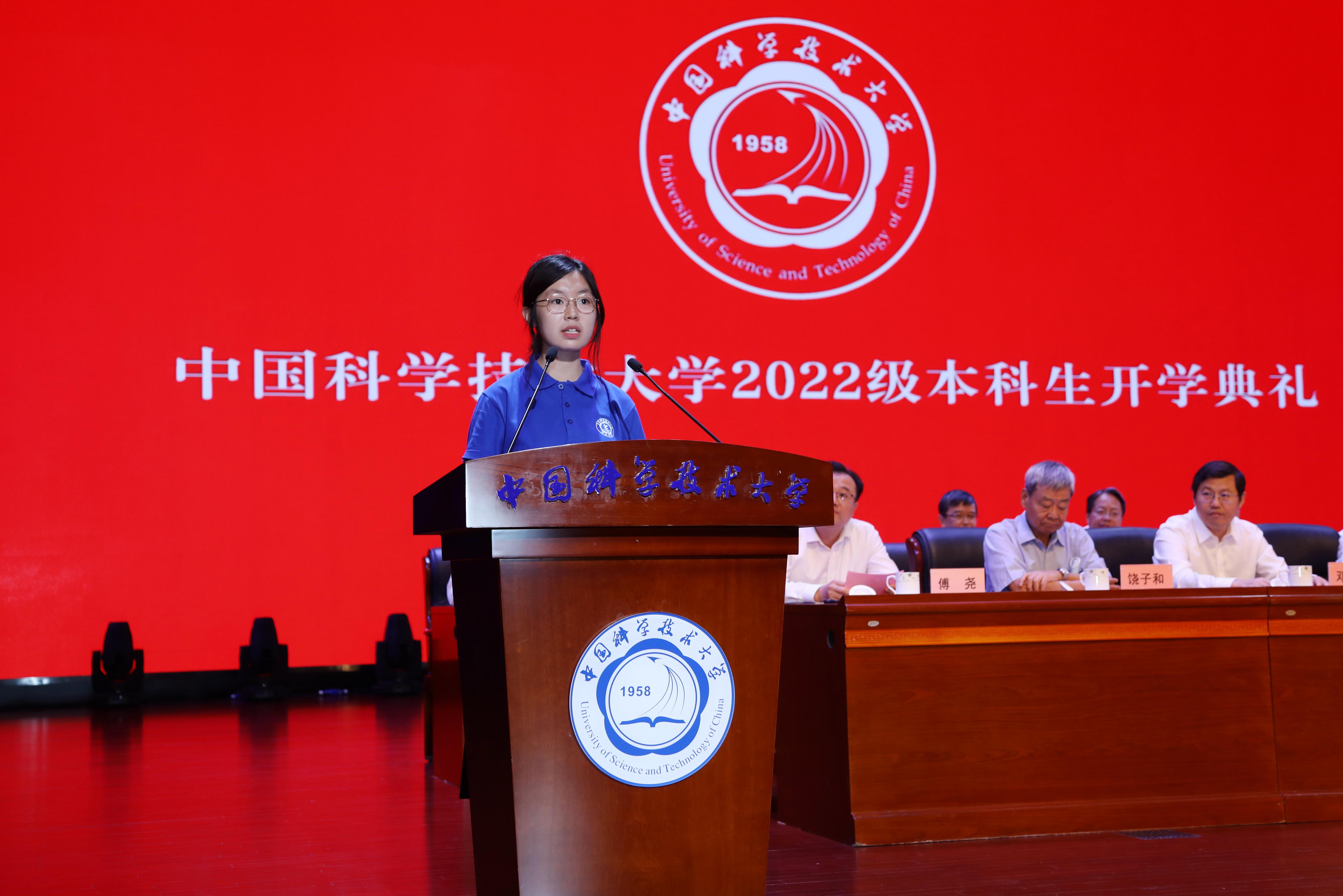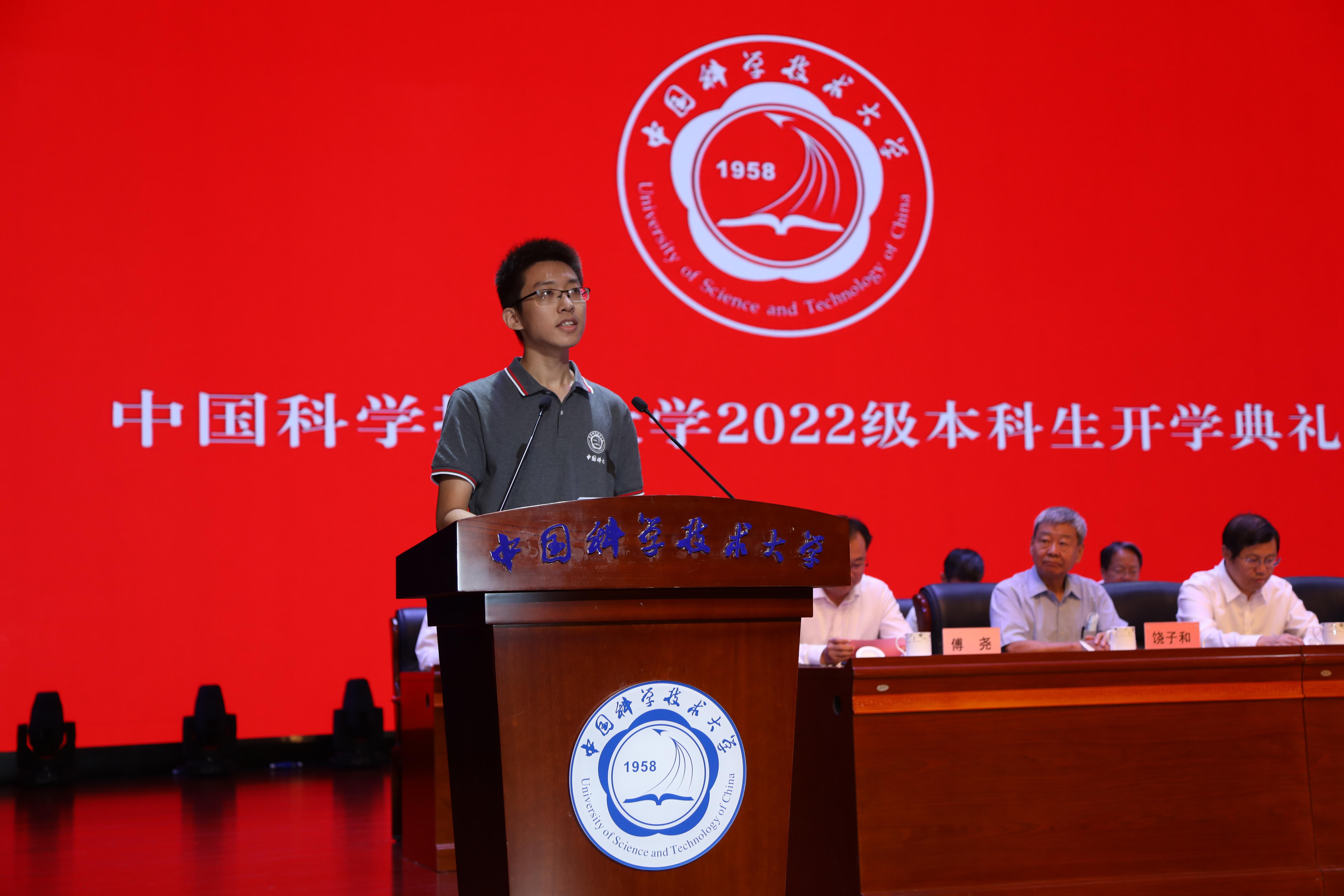 数学科学学院高歌同学作为新生代表发言。高歌说,科大,这片用无数科研人的汗水浇灌数十载光阴沃土,是我们心目中的大学最美的模样。希望我们都能以孩童的好奇去探索未知,以少年的热情去憧憬未来,以青年的韧性去面对挑战,以中年的理性去分析问题,以老年的沉稳去做出决定,以科大人之名,谱写人生最辉煌的篇章。