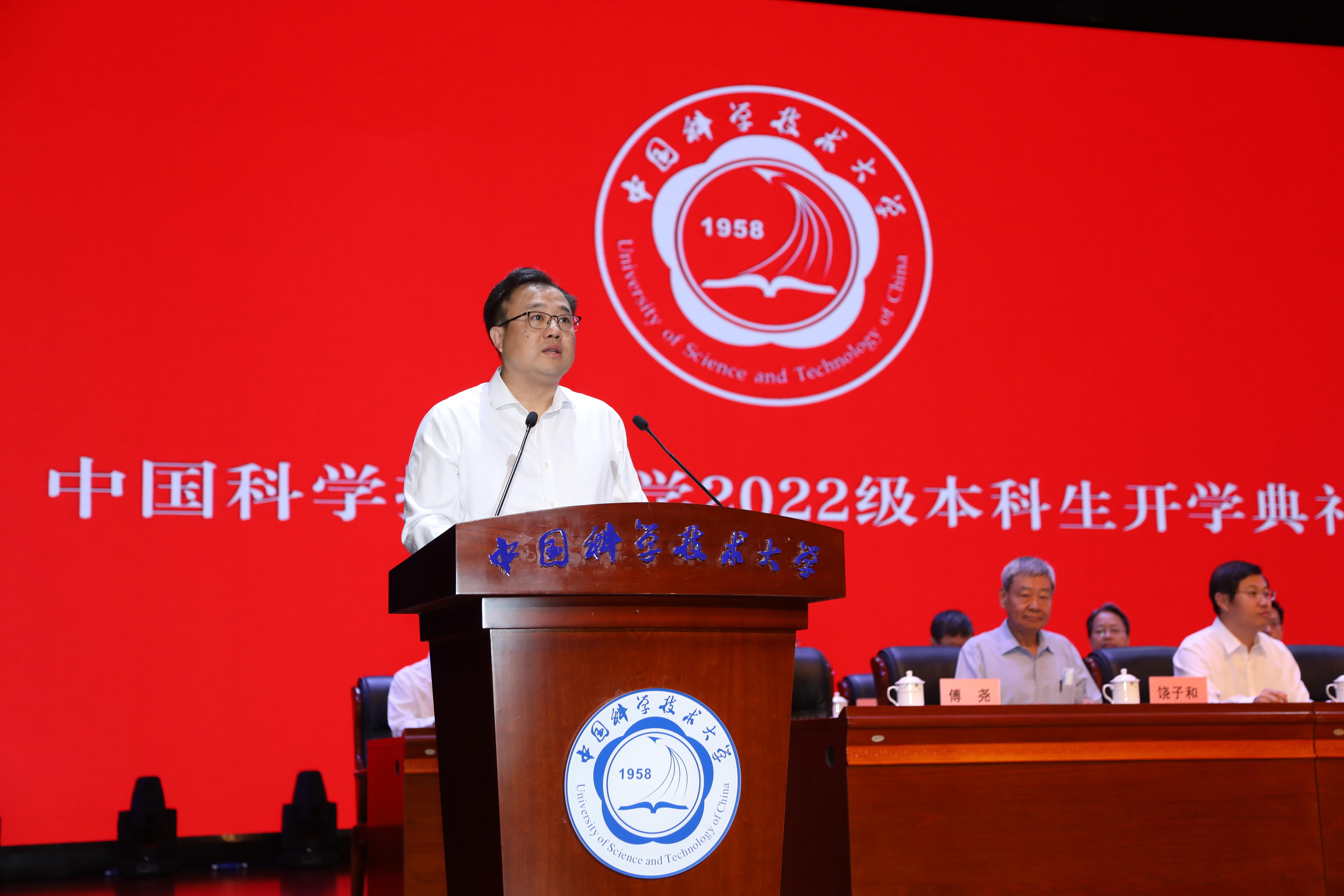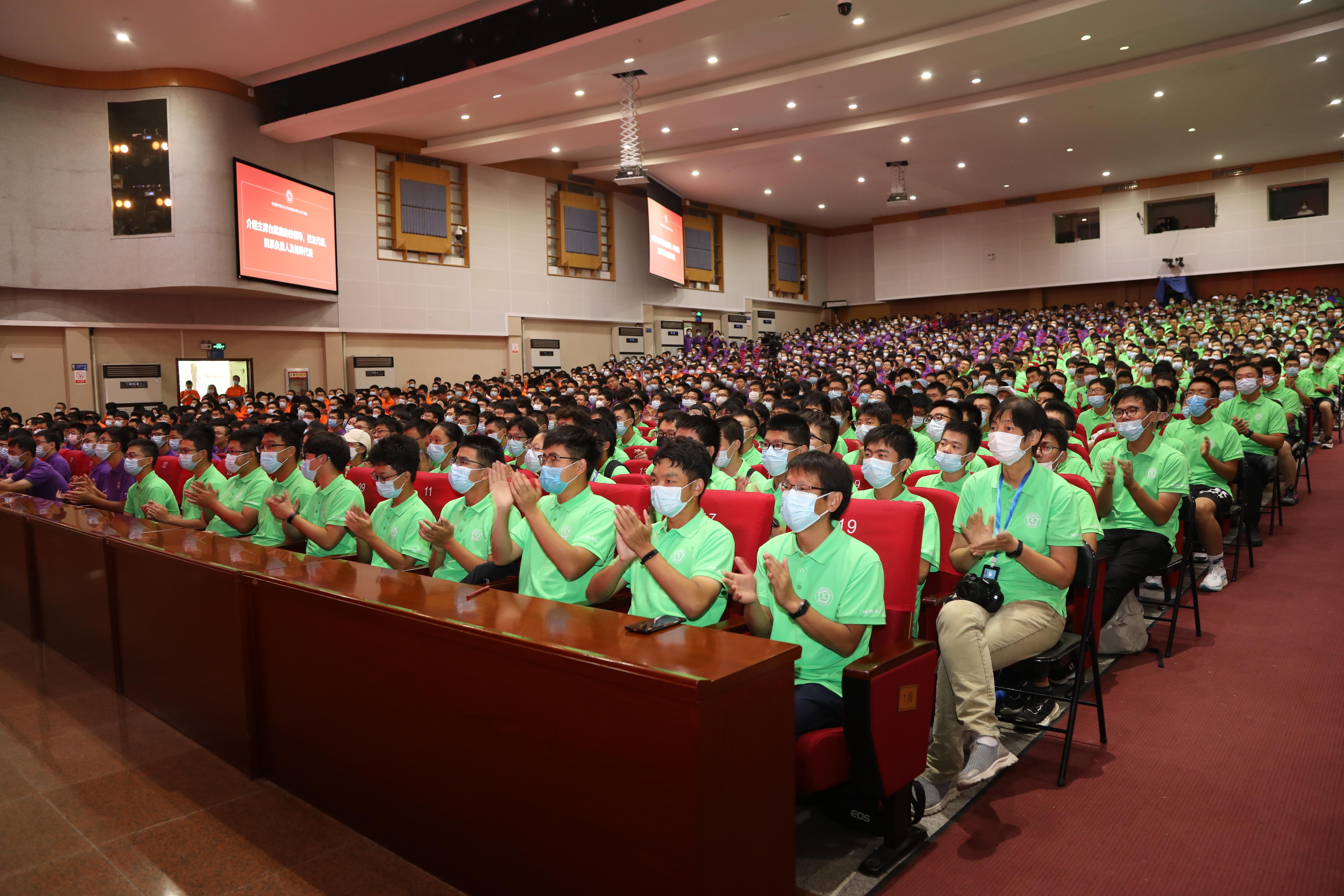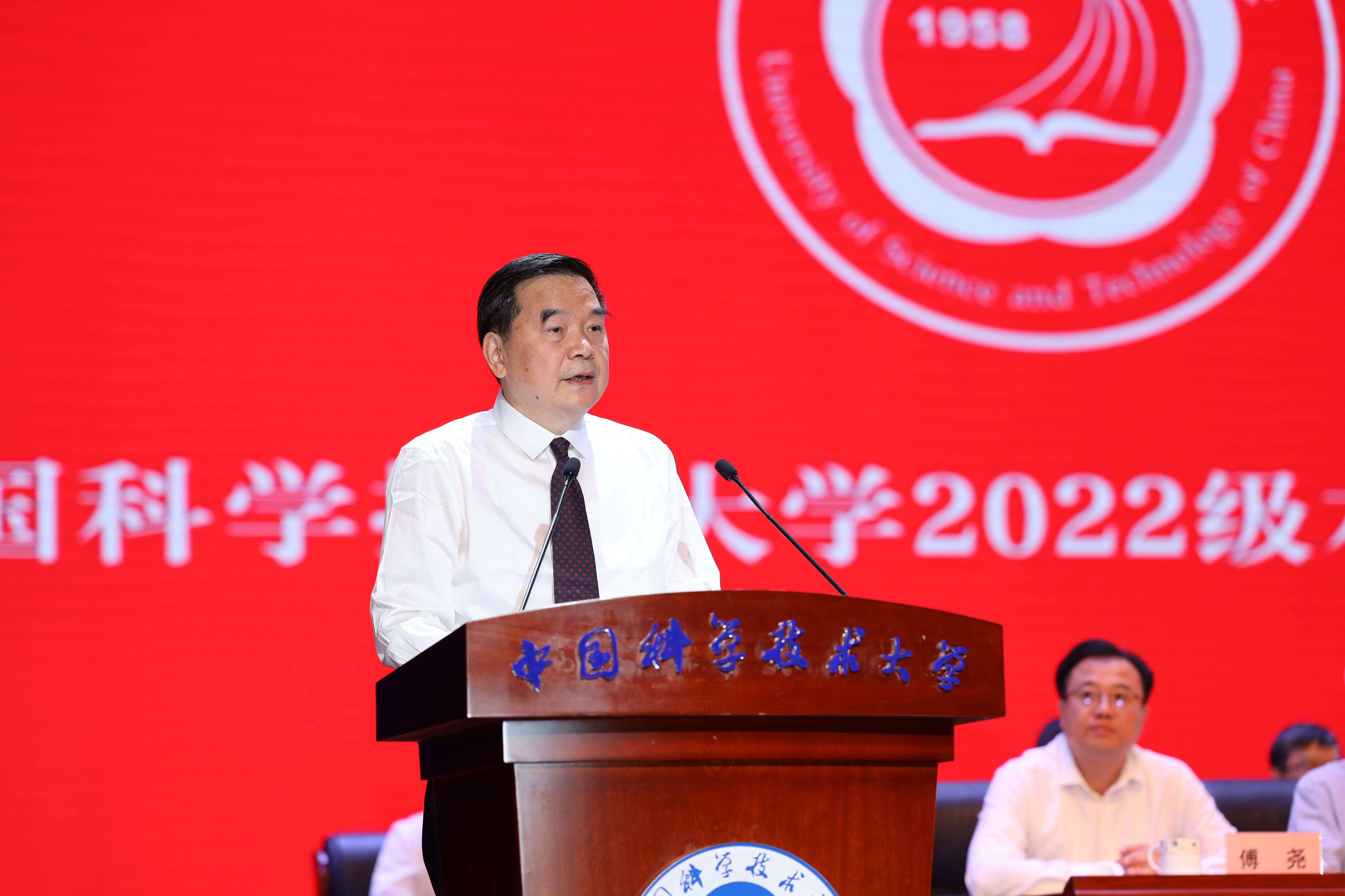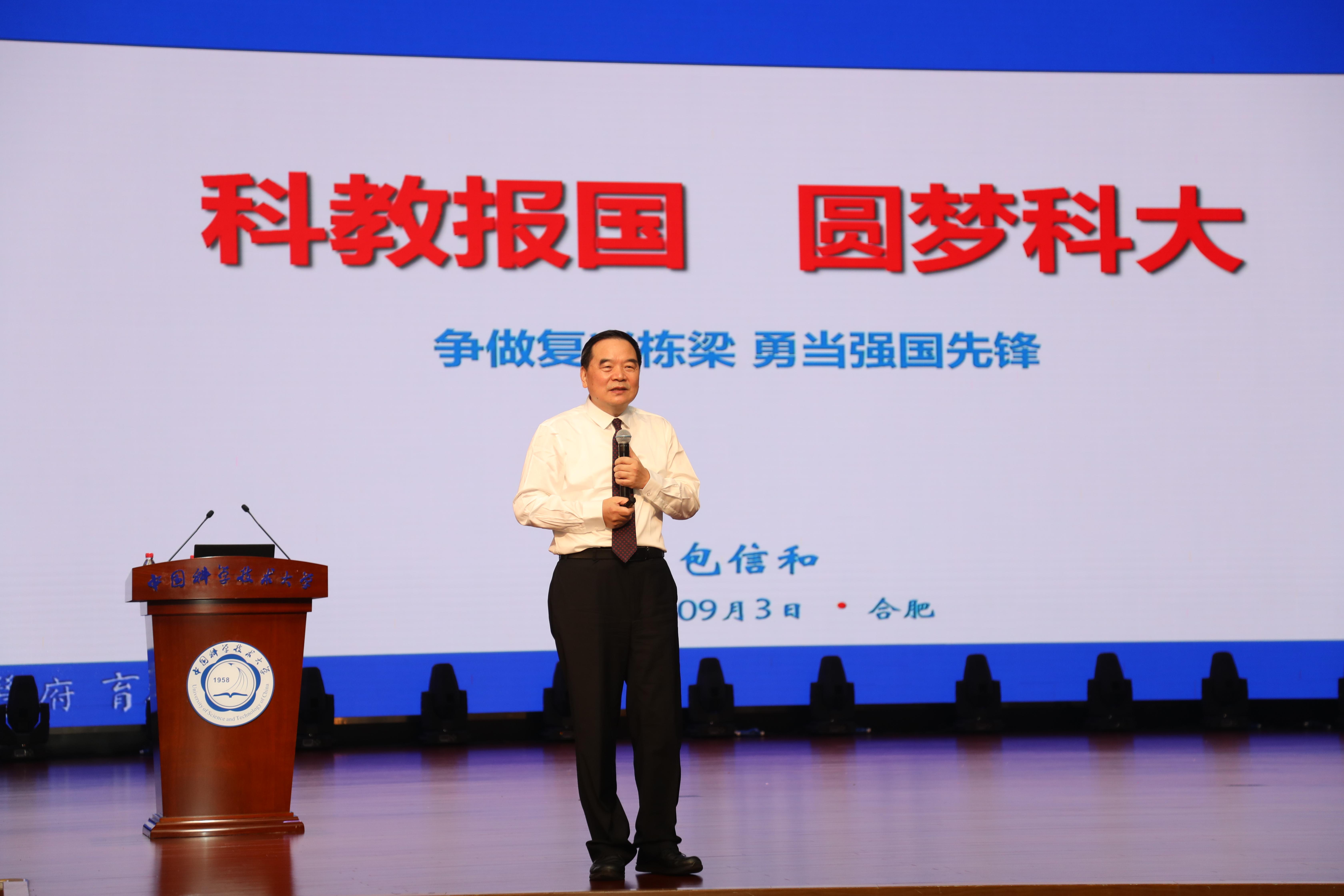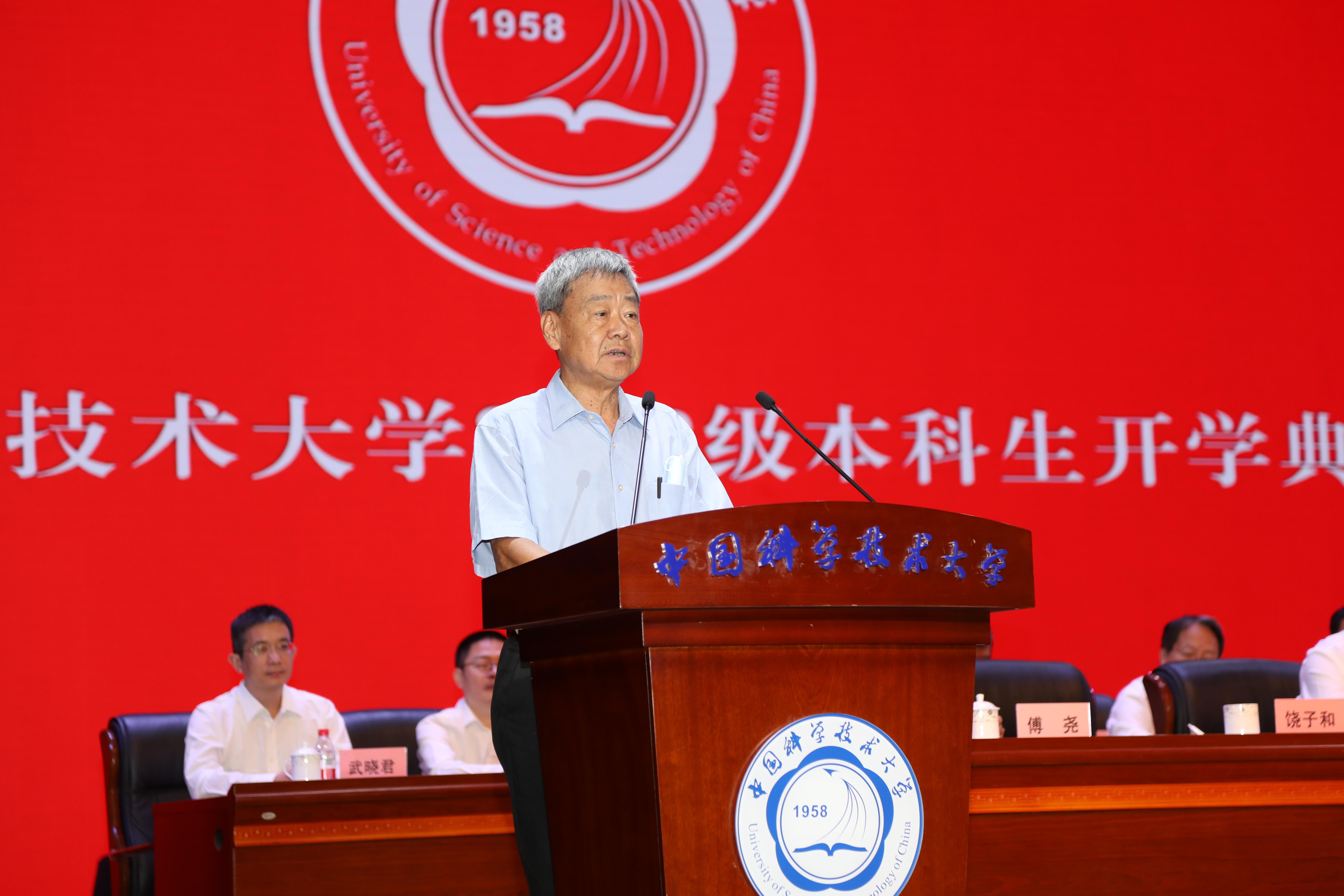 在热烈的掌声中,校长包信和院士首先代表全校师生员工,向所有努力拼搏、圆梦科大的同学们表示热烈的欢迎和衷心的祝贺。包信和指出,国家的希望在青年,民族的未来在青年。今年是中国共产主义青年团成立100周年。百年来,一代又一代青年奋力追梦,以青春之歌筑就青春之国。中国科大是一所为“两弹一星”事业而创办的大学,是一所值得敬重的大学。包信和希望同学们“来科大,读好书”,用心去读好报国、科学、励志“三本书”。