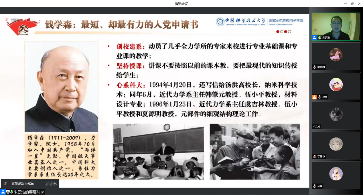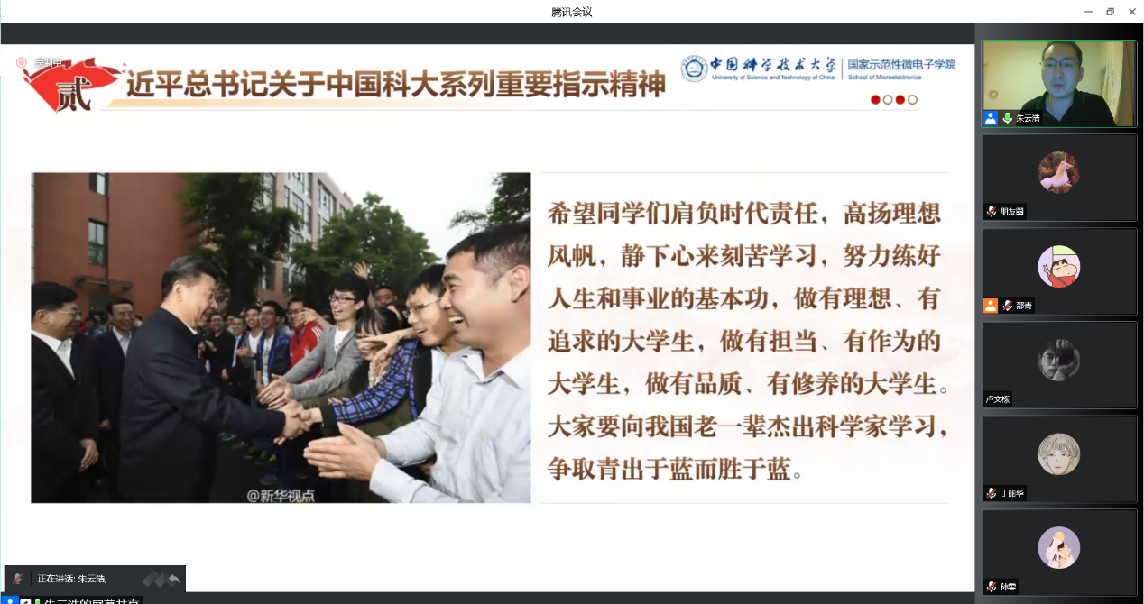 入学教育由思政引领、教学培养、资源运用三大模块共5个主题报告组成。朱云浩代表学院对2022级研究生新生表示欢迎和祝贺,勉励大家要勤奋学习、不断进取,勇攀高峰、早日成才,积极投身我国微电子事业建设中去。随后,朱云浩作了题为《牢记殷殷嘱托,传承红色基因》主题报告,围绕中国科大历史沿革、习近平总书记关于中国科大系列重要指示精神、传承老一辈科学家红色基因等方面,详细介绍了中国科大的创校背景,勉励大家牢记习近平总书记殷殷嘱托,始终以严济慈、钱学森、钱临照等老一辈科学家为榜样,心系“国家事”、肩扛“国家责”,努力报效祖国、服务人民。最后,朱云浩向大家介绍了入党的要求和流程,鼓励大家积极向党组织靠拢。