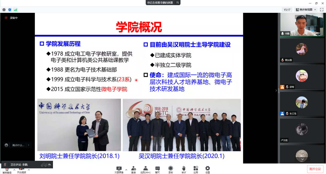 青年教师李鹏教授代表学院从发展历史、建设目标、师资队伍、科研方向和人才引进等几个方面对学院进行了详细介绍。他指出,中国科大微电子学院深入贯彻落实习近平总书记关于研究生教育工作的重要指示精神,积极服务国家战略需求,加强人才队伍建设,改革课程体系,深化产教科教融合,加快培养集成电路高层次人才,为实现科技自立自强做出重要贡献。