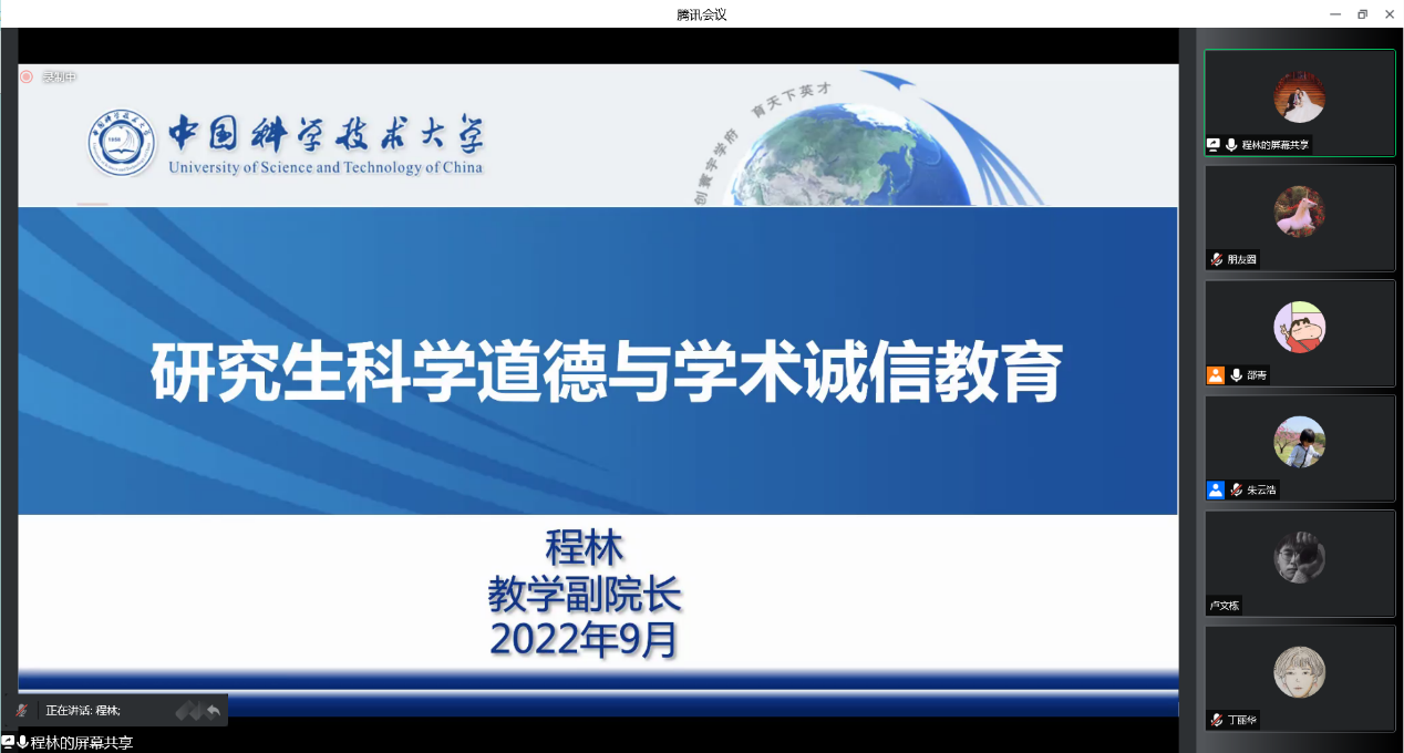 程林作了研究生科学道德与学术诚信的主题教育报告,详细介绍了研究生在学术研究和学术活动中必须遵守的学术道德规范。邵青介绍了研究生培养方案和学习管理规定,解读了硕博研究生培养方案以及需要注意的问题,并对大家关心的选课问题一一作出解答。随后,殷昊、张健分别代表研究生和代培生新生发言。