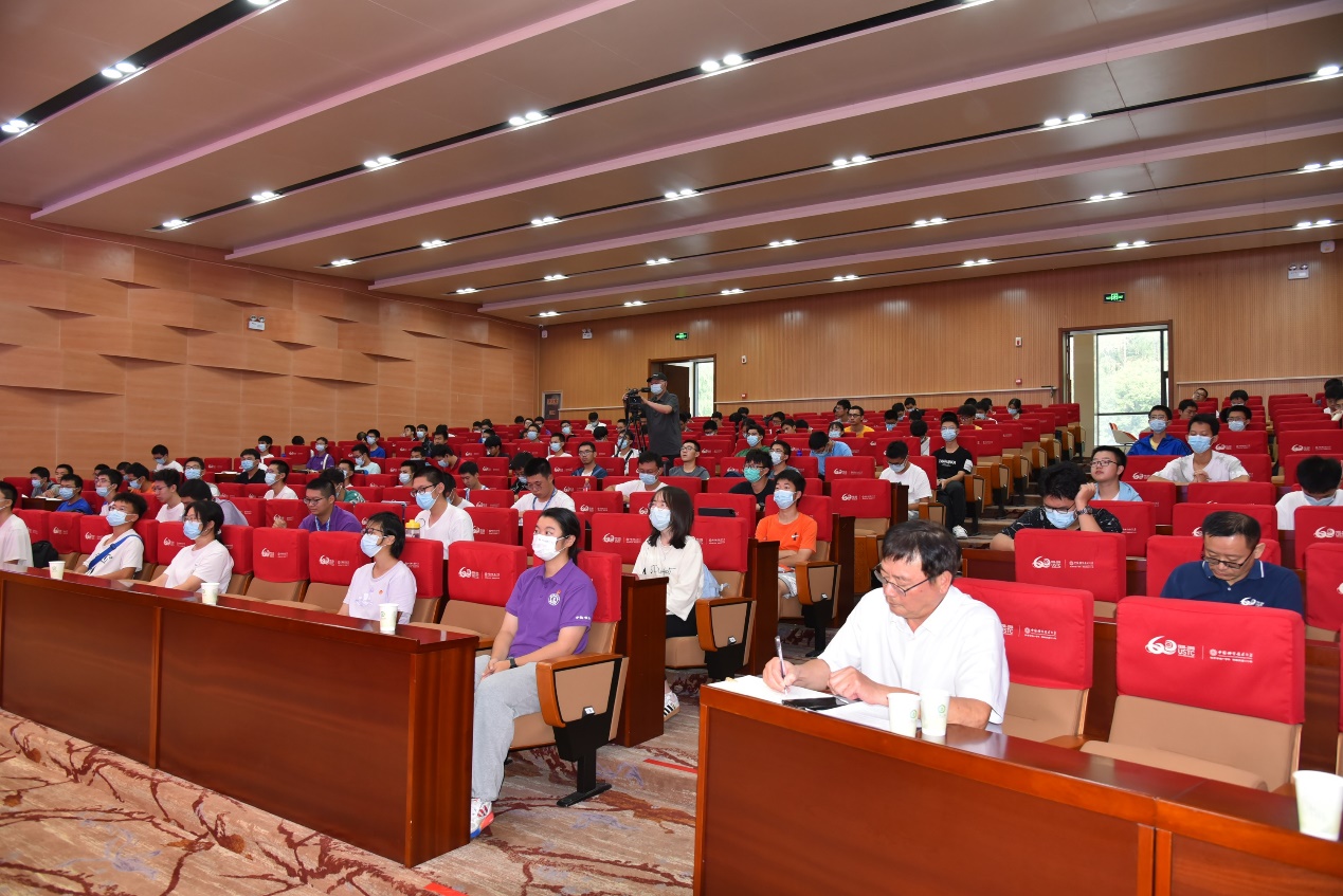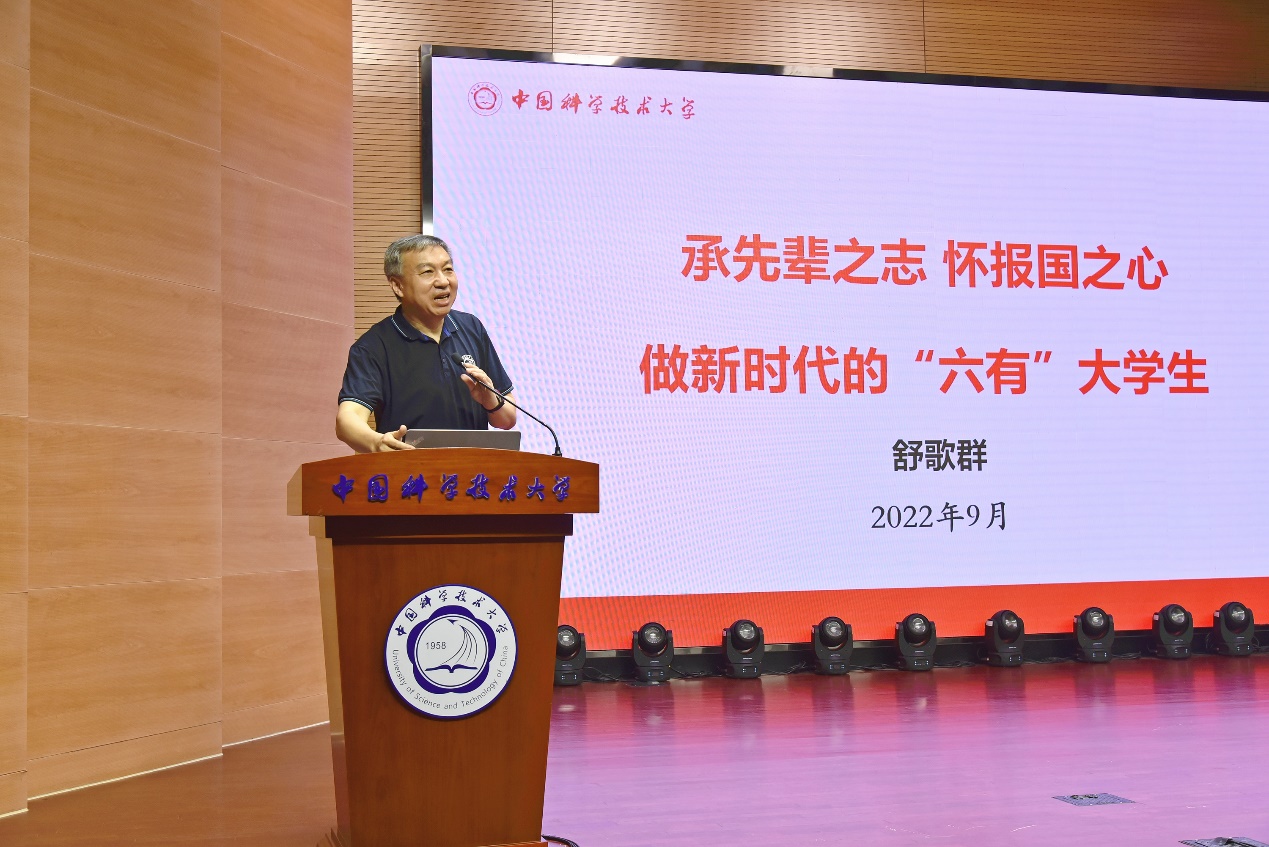 舒歌群带领同学们回顾了中国科大六十四年栉风沐雨、三次创业、再创辉煌的办校历程,以及钱学森、郭永怀、钱临照、杨承宗四位科学家的光荣事迹,并号召大家学习这些老一辈科大人身上所蕴含的宝贵的科大精神。从学校总体概况、潜心立德树人、执着攻关创新、人才培养成效等方面,向同学们展示了在中国科大就读是一种怎样的体验。
