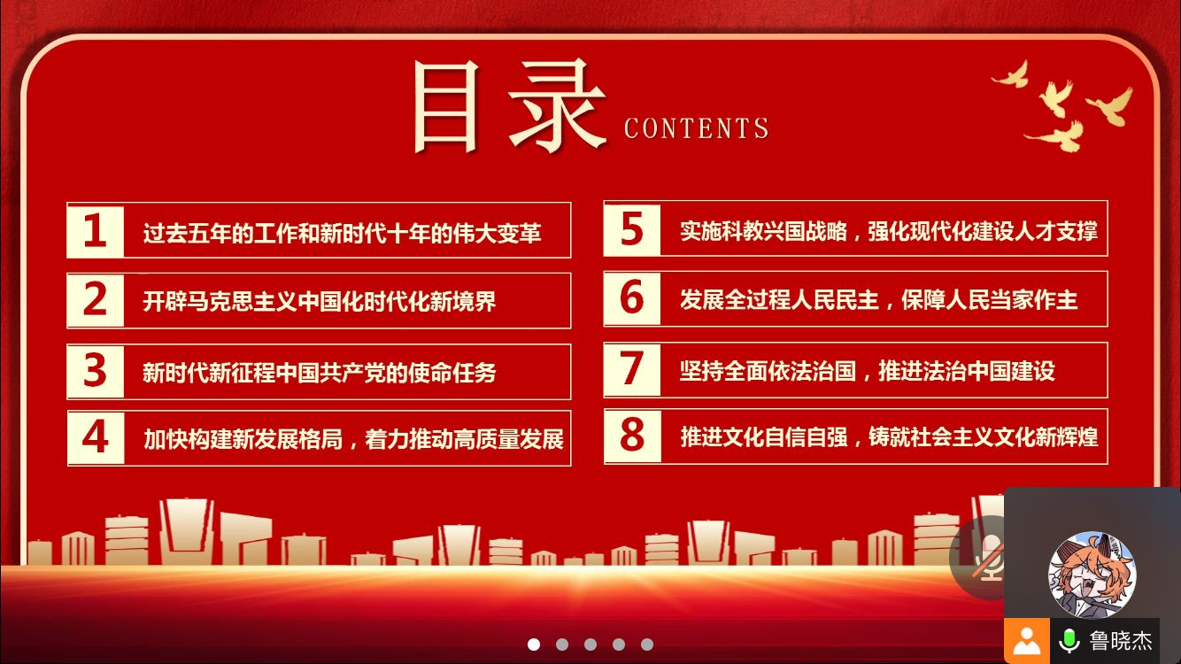 中国共产党第二十次全国代表大会,是在全党全国各族人民迈上全面建设社会主义现代化国家新征程、向第二个百年奋斗目标进军的关键时刻召开的一次十分重要的大会。为深入学习大会精神,合肥微尺度物质科学国家研究中心2019级硕士博士2班于10月25日召开线上会议,集中学习党的二十大报告,主讲人为鲁晓杰同志。