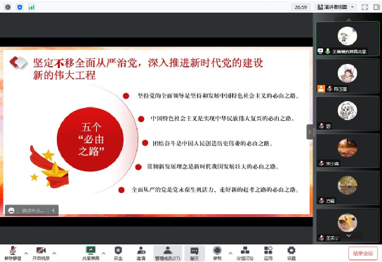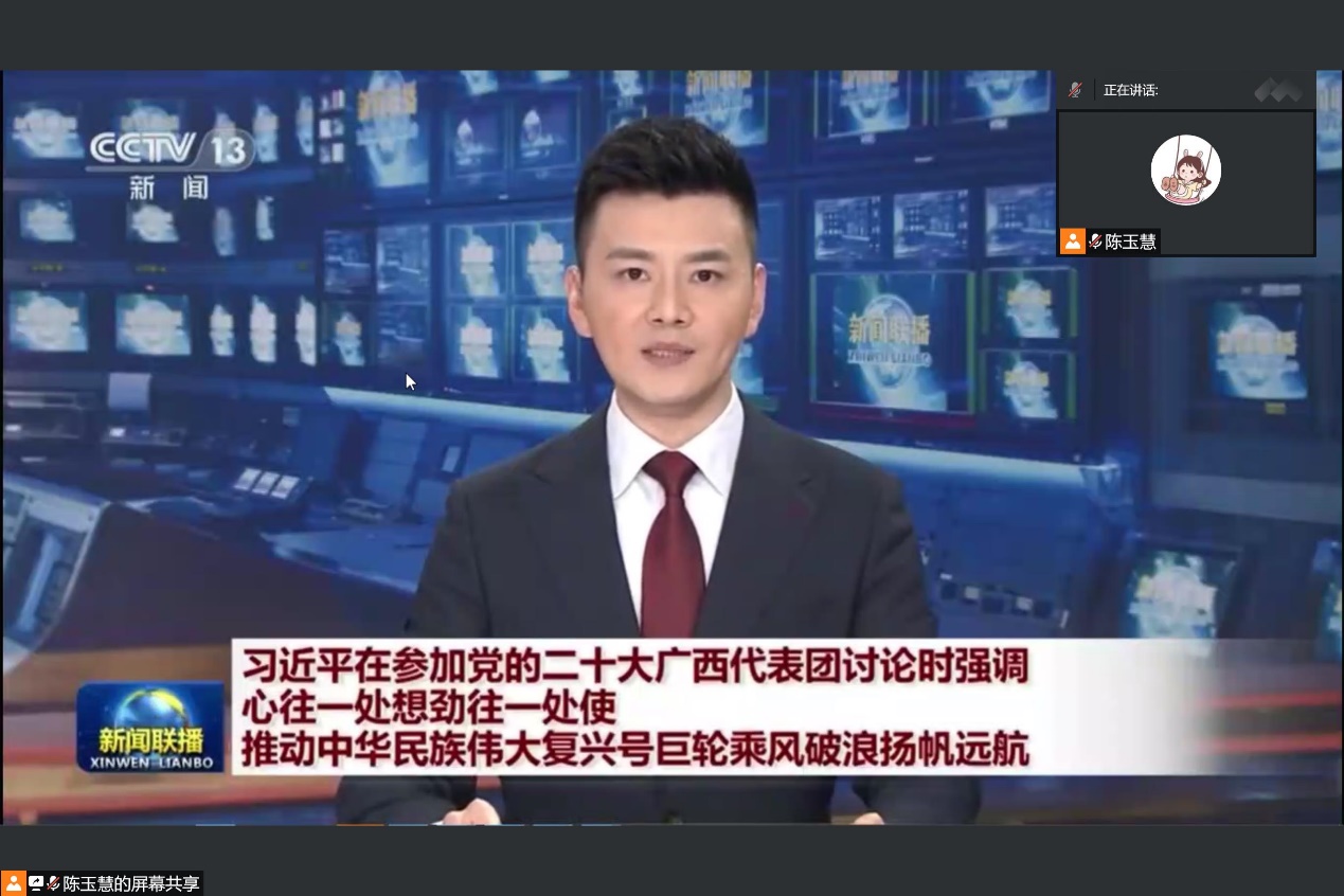 与会同学一起观看了新闻联播,学习习近平总书记在参加党的二十大广西代表团讨论时的重要讲话精神。习近平总书记鲜明提出了五个“牢牢把握”:要牢牢把握过去5年工作和新时代10年伟大变革的重大意义,牢牢把握习近平新时代中国特色社会主义思想的世界观和方法论,牢牢把握以中国式现代化推进中华民族伟大复兴的使命任务,牢牢把握以伟大自我革命引领伟大社会革命的重要要求,牢牢把握团结奋斗的时代要求。全党全国各族人民要在党的旗帜下团结成“一块坚硬的钢铁”,心往一处想、劲往一处使,推动中华民族伟大复兴号巨轮乘风破浪、扬帆远航。