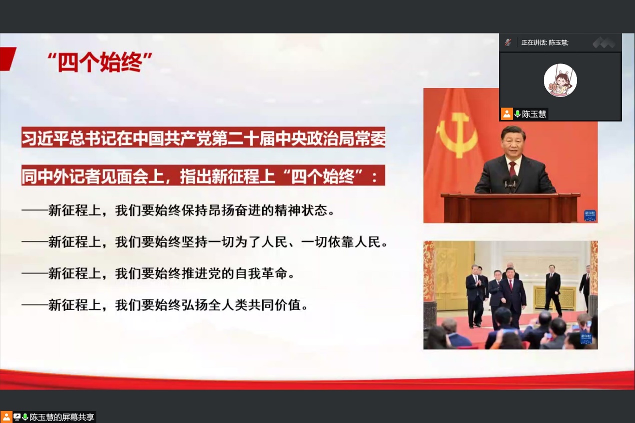 王晨晨同志领学了习近平总书记代表第十九届中央委员会向中国共产党第二十次全国代表大会所作的报告。她表示,党的二十大是在中国共产党团结带领全国各族人民奔向全面建设社会主义现代化国家新征程之际召开的一次十分重要的大会。党的二十大报告深刻总结了过去五年和新时代以来十年的不平凡的奋斗历程。支部同志通过学习报告全文,认真领会了习近平总书记在报告中提出的一系列新观点、新论断、新思想、新战略和新要求,并对大会的主题、一个中心任务、“两步走”战略安排、三个“务必”、五个“必由之路”、六个“必须坚持”等重要论述进行了学习。同学们纷纷表示,在实现中华民族伟大复兴的新征程上,我们要紧紧围绕党的中心任务,为实现第二个百年奋斗目标、以中国式现代化全面推进中华民族伟大复兴而不懈奋斗。