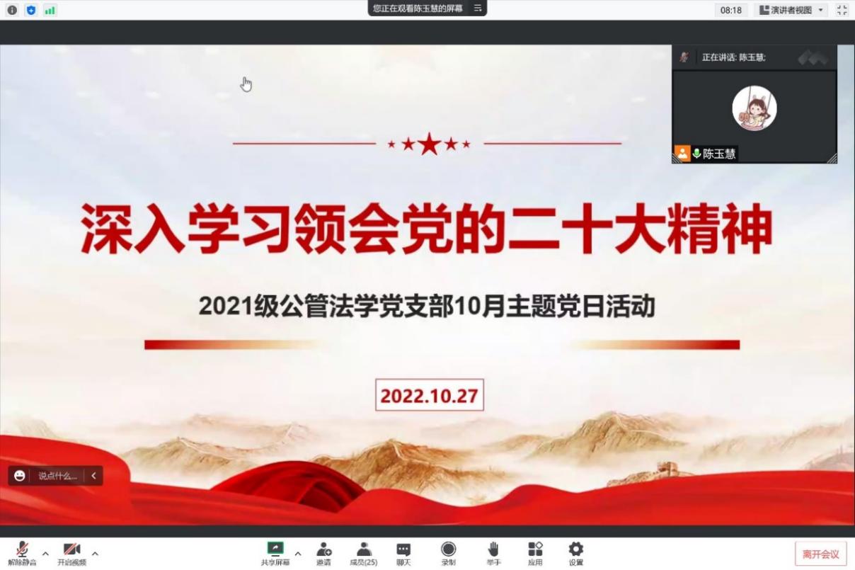 为学习领会党的二十大精神,10月27日,公共事务学院2021级公管法学研究生党支部以“学习领会党的二十大精神”为题开展主题党日活动。支部全体党员、入党积极分子等共同参与活动,党支部书记宋小燕老师出席活动。活动由党支部常务副书记陈玉慧主持。