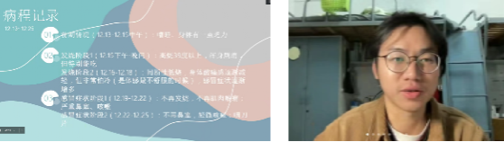 首先,韩子傲同学回顾了自己的病程,并给尚未恢复的同学提出了建议,如在恢复期要注意休息,发烧阶段谨慎洗澡,防止着凉;最好用水银温度计监测体温,高烧及身体酸痛阶段,可在睡前吃布洛芬保证睡个好觉。黄剑良同学建议大家尽量控制咳嗽,减少对呼吸道的伤害,未感染的同学无需过度紧张和精神内耗。