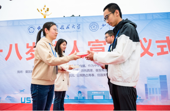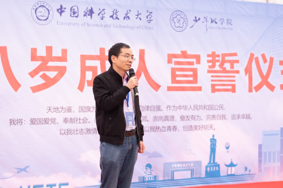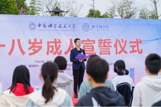 学生党员、郭沫若奖学金获得者陈宝骥作为成人代表发言。他希望同学们静下心来,珍惜机会,刻苦学习;目标明确,以平常心面对困难和挫折,自强不息。他盼望同学们坚持“红专并进、理实交融”的校训,坚守“科教报国、追求卓越”的初心,将爱国主义情怀和时代责任融入个人的理想和追求中去。
