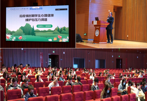 报告会上,沈克祥首先从心理健康教育的时代背景分析切入,重点强调近几年新冠疫情对高校大学生的心理冲击与影响,引导同学们客观面对,高度关注自我心理健康状况。随后,沈克祥引用世界卫生组织(WHO)对于健康的科学界定,帮助同学们完整理解健康内涵,认识到心理困扰与心理障碍的区别,消除对自我心理问题的“病耻感”,增加成长过程中自我接纳度;沈克祥结合20余年心理工作的实践经验,引用贴近学生实际的心理个案,辅以详实的心理调查数据,介绍了我校学生心理健康的整体现状、特点和问题。从心理学的专业视角,沈克祥为现场师生诠释了各种心理问题发生的内在机制和影响要素,帮助大家知晓了心理问题的缘由,提升了大家自知、自助和自我成长的能力。面对负面情绪和心理压力,沈克祥从与负性情绪共存、安心先会安身、转换看问题视角、构建社会支持资源已经专业心理支持等方面为师生介绍了基本应对技能和方法。最后,沈克祥强调学校高度重视和关注学生心理健康,并向现场师生介绍了心理中心的工作设置、专业资源和求助方式,热情鼓励大家针对心理困扰要科学认知,理性面对,积极改变,勇于挑战。