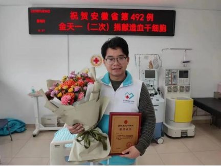 2020年6月的一天,金天一接到合肥市红十字会的电话,得知自己和一位白血病患者配型成功。在合肥市红十字会工作人员陪同下,金天一顺利完成了相关体检,并在8月底住院为抽取造血干细胞作相应准备。当年8月25日,金天一在科大附一院成功捐献造血干细胞,北京一位急性淋巴细胞白血病患者因此获得了手术治愈的机会。采集的过程持续了约一个上午三四个小时,最终完成了约300毫升的采集,完成后直接送到了这位北京患者的身边。金天一说:“配型成功不容易,顺利完成捐献采集,就是我能够给予患者最大的帮助!”