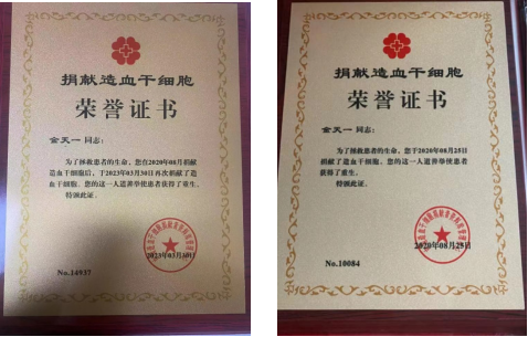 2020年8月25日,金天一曾为同一位患者捐献过造血干细胞,患者因此获得了移植手术的机会,那是他第一次为这位患者送去生存的希望。