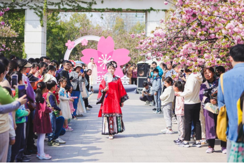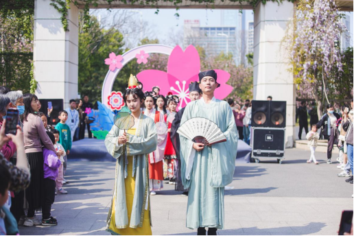 背景音乐变化到《江上清风游》,樱花大道上身着魏晋南北朝时期服装的同学充分展示了自然洒脱、清秀空疏的气质,让在场的同学们感受到魏晋南北朝时期各民族的相互影响、相互吸收、渐趋融合的特点。