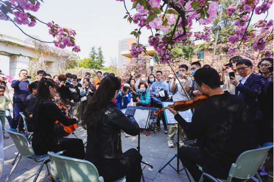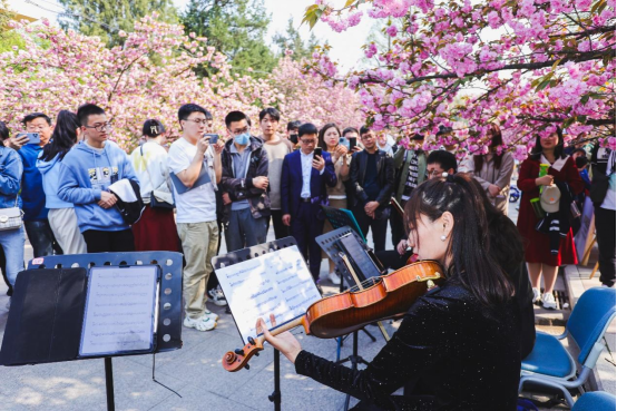 现场,合肥知名乐团结合春日主题进行现场演奏,践行“高雅艺术进校园”的活动宗旨,旨在提高同学们音乐鉴赏能力和审美能力。