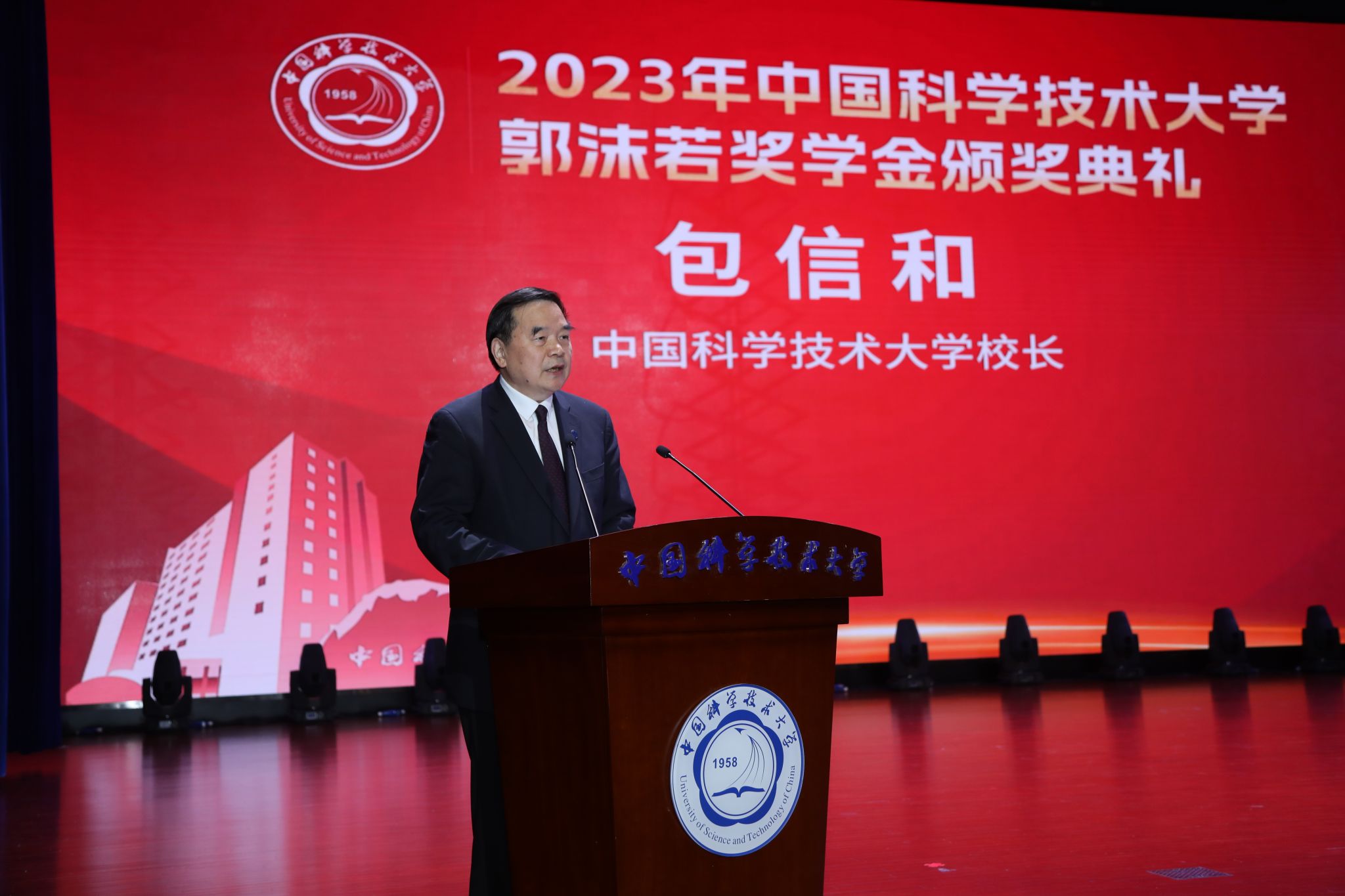 包信和校长首先向荣获第41届、42届郭沫若奖学金的65位同学表示热烈的祝贺,向远道而来的各位家长、各位中学校长和老师表示诚挚的欢迎。他以我校81级少年班校友、第五届郭奖获得者、美国国家科学院院士骆利群,以及85级校友、第九届郭奖获得者、中国科学院院士王赤为例,讲述了他们面向世界科技前沿、瞄准国家战略需求,自强不息、砥砺奋进,在各自领域取得巨大成就的事例,勉励同学们今后无论身在何处,都永远秉持科大人“科教报国、追求卓越”的初心使命,砥砺奋进、再创辉煌。