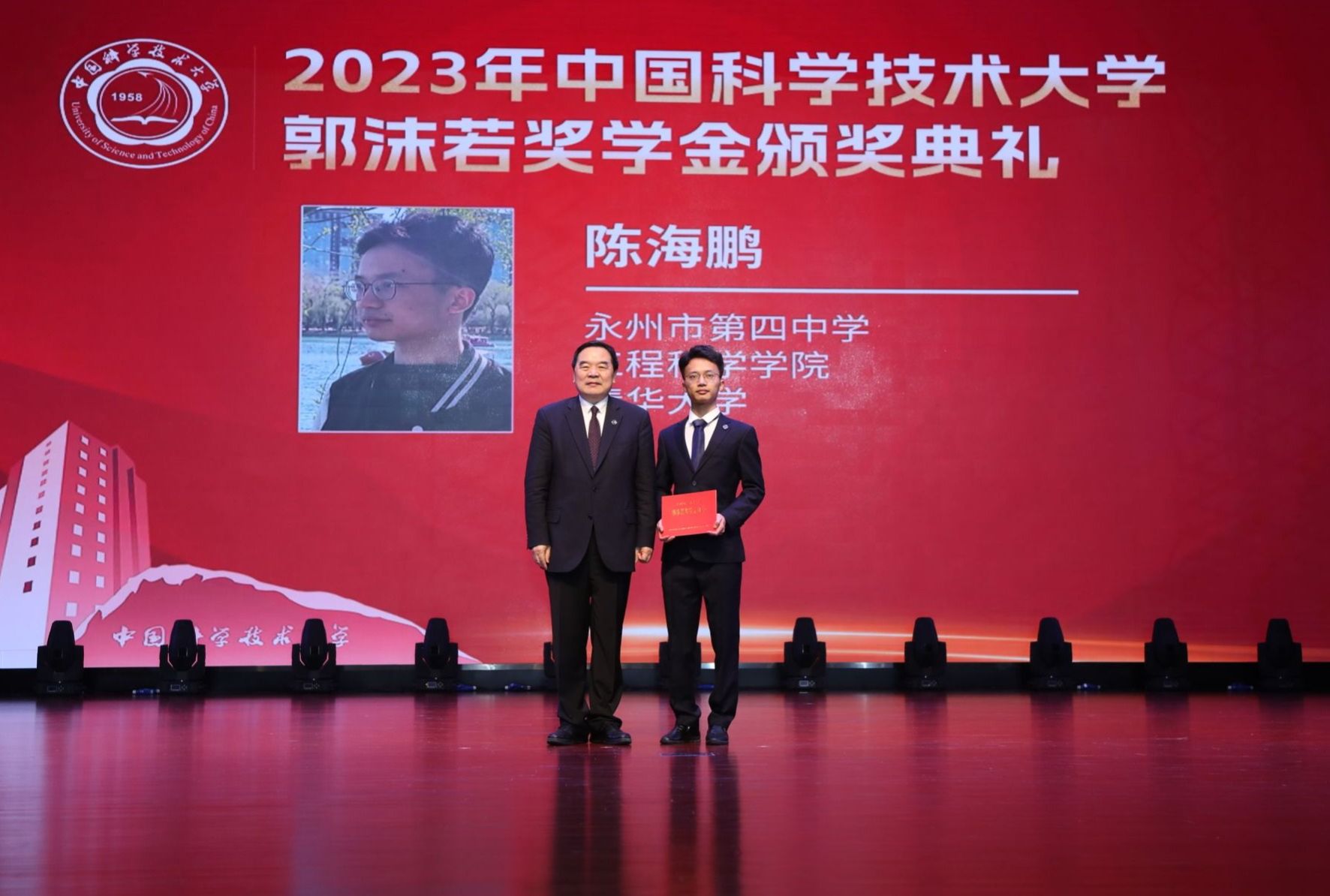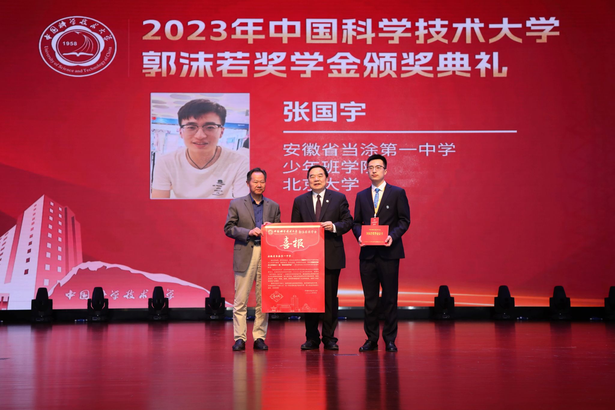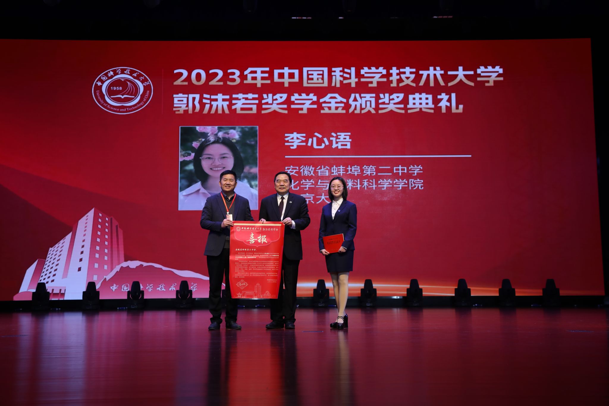 在颁奖环节,包信和校长首先为郭沫若奖学金获奖学生逐一颁发获奖证书,为获奖学生中学校长颁赠“喜报”,并与获奖学生及其家长、老师代表一同合影留念。