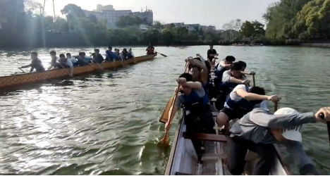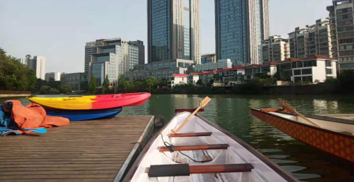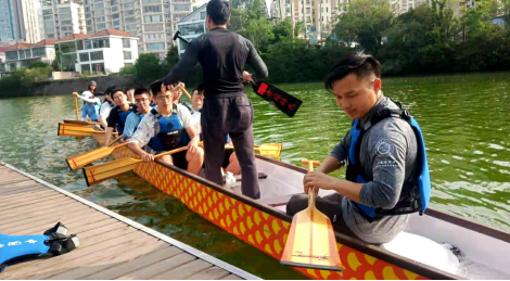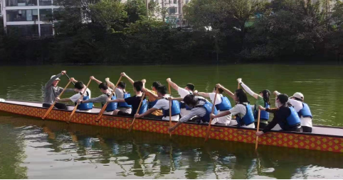 在岸上热身运动结束后,指导老师们严格检查确认了同学们救生衣穿着方式无误,组织同学们开展了龙舟文化实践。龙舟是一项水上体育竞技运动,在下水前老师们反复强调了划龙舟的注意事项和竞技要领,要求同学们听从指挥、服从安排,确保船体平衡。在校龙舟队专业队员的指导下,同学们从基础的握桨和划桨动作要领学起,“桨插满”“视线注意前方与旁边同学划桨的频率”“手拉直,主要用腰部力量”和“插桨!划!插桨!划!……”,经过多次练习后,大家基本掌握了划船的节奏控制和发力方式。同学们进行了两公里的龙舟体验,划的过程中心往一处想、劲往一处使,深刻感受到了龙舟作为中华传统体育活动所蕴含的“同舟共济”的魅力。