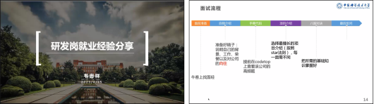 网络与计算实验室的韦忠祥学长侧重研发岗位的介绍,细致地分享了如何做求职前的准备,从简历常见问题、基础知识准备和面试准备三个方面入手,介绍了研发岗面试的流程。韦学长总结了计算机专业求职的招聘特点及面试内容,结合科大计算机专业同学特点给出求职建议,引导同学们扬长避短找到适合自己的职位。