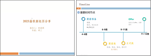 算法与数据应用研究组的周良滢学姐带来了证券、银行及选调的求职经验,介绍了证券和银行的基本信息与投递流程,描述了证券和银行在计算机专业的招聘情况。学姐从自己选调经历出发,介绍了不同省份选调的流程细节,针对性地给出了笔面试的备考建议。周学姐鼓励同学们求职中要满怀信心,持之以恒,善于排解情绪,勉励同学们“人生万事需自为,跬步江山即寥廓”。