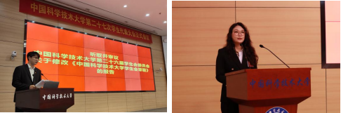 大会听取了刘子豪所作的《关于修改〈中国科学技术大学学生会章程〉的报告》和陈至伟所作的《关于修改〈中国科学技术大学研究生会章程〉的报告》。